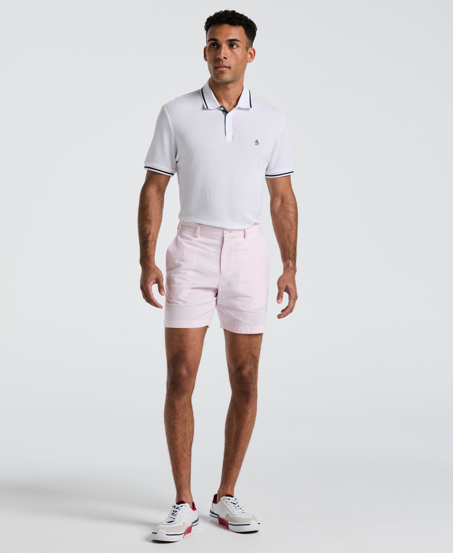 Step up your summer shorts game with these breezy linen-blend shorts from Original Penguin. Cut for a versatile 7" inseam, the flat front shorts create a smooth, streamlined silhouette that looks equally stylish paired with your favorite polo or a casual tee. Made from a lightweight blend of linen and cotton, the men's shorts provide plenty of airflow to keep you comfortable when the temperature rises. Welt back pockets give these casual warm-weather shorts a polished touch.