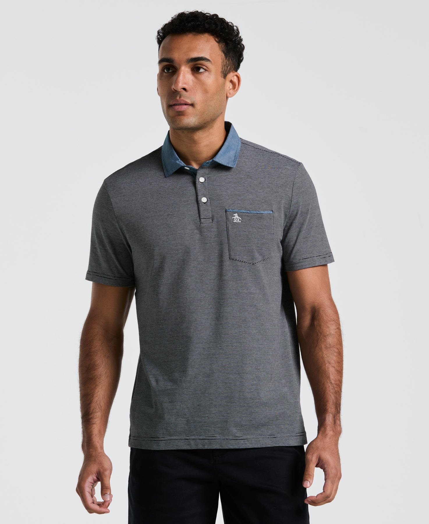 This Original Penguin polo top always has your back. Featuring a flattering slim fit, short sleeves and a ribbed chambray collar, it's a comfortable and stylish addition to your casual wardrobe. This men's polo is made from cotton jersey fabric that is breathable and feels soft against the skin. An all-over striped print, contrasting collar and cuffs, and a pocket with trim add stylish detail while still remaining versatile.