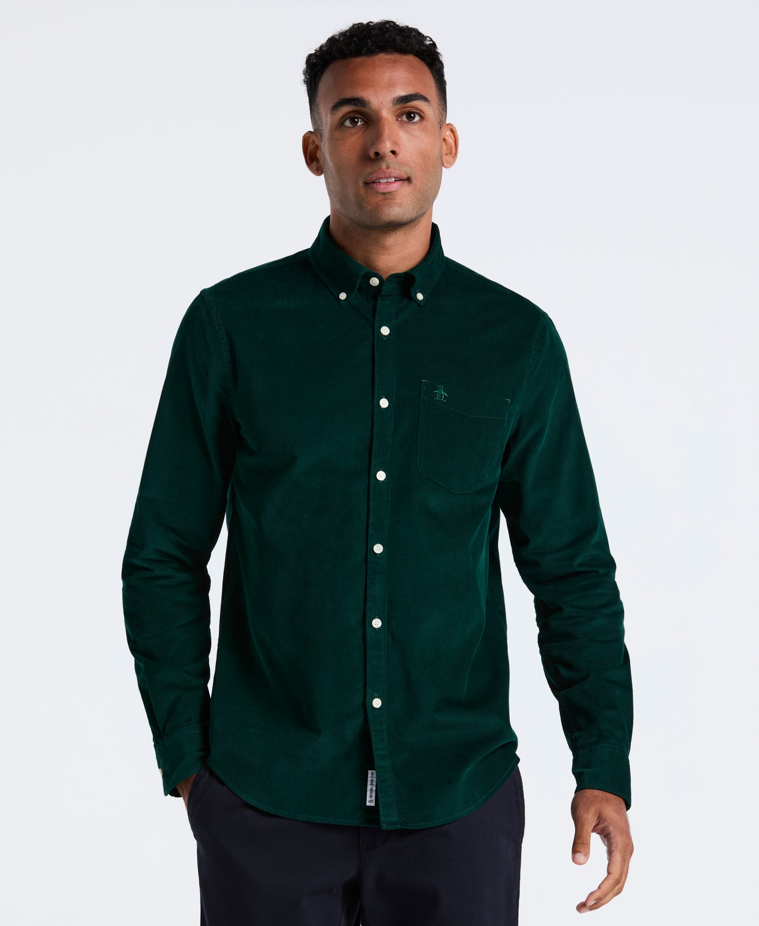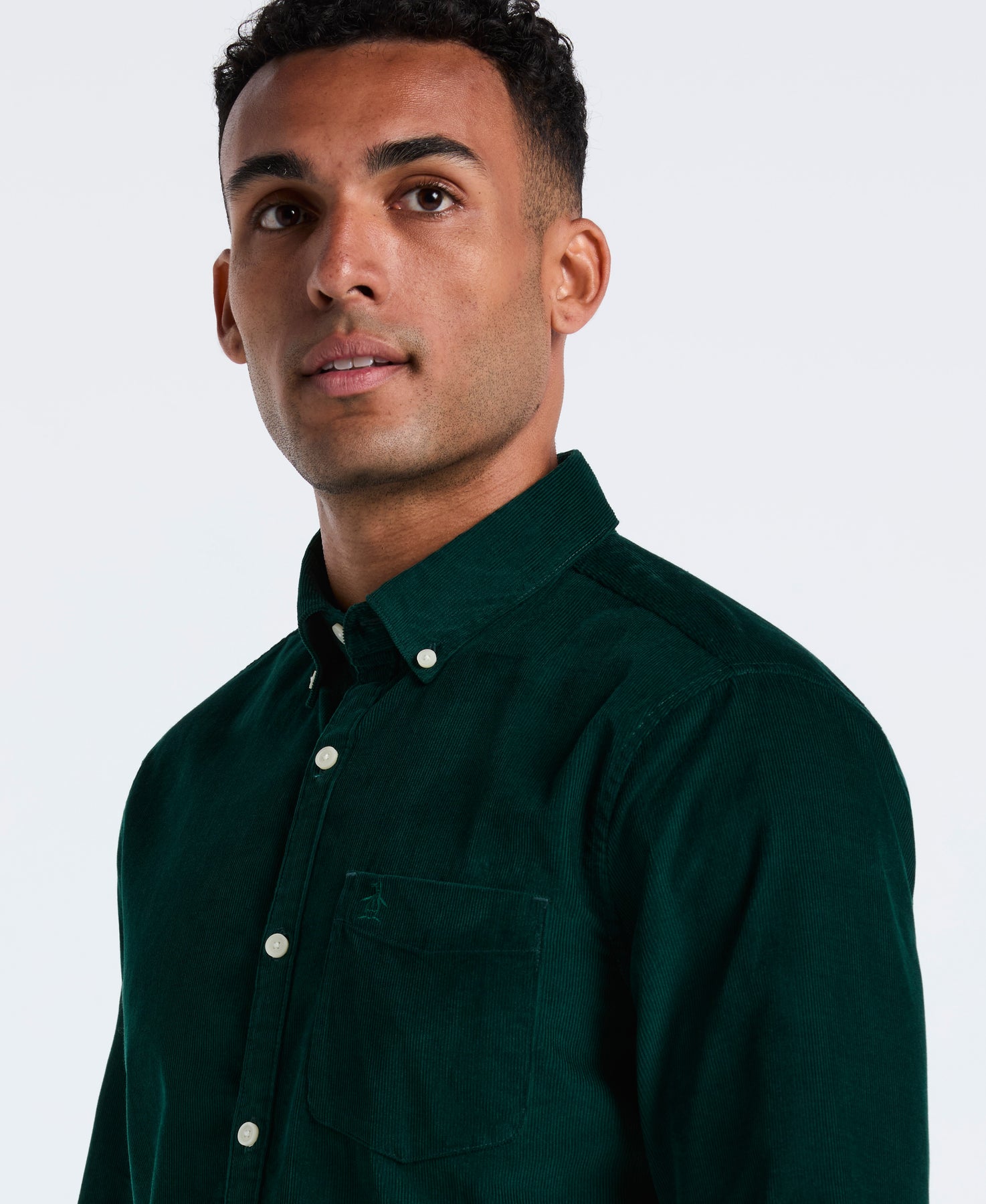 Bring warmth and texture to your cold weather outfits with this classic solid-colored corduroy shirt from Original Penguin. The men’s button-up shirt is made from 100% cotton for breathable comfort, and it has a sleek slim fit for a modern look. Practical and versatile, it’s topped with a button-down collar that stays neatly in place all day. The long sleeve shirt’s curved hem looks smart worn loose over jeans or chinos, and it tucks in nicely when you want a more polished look.