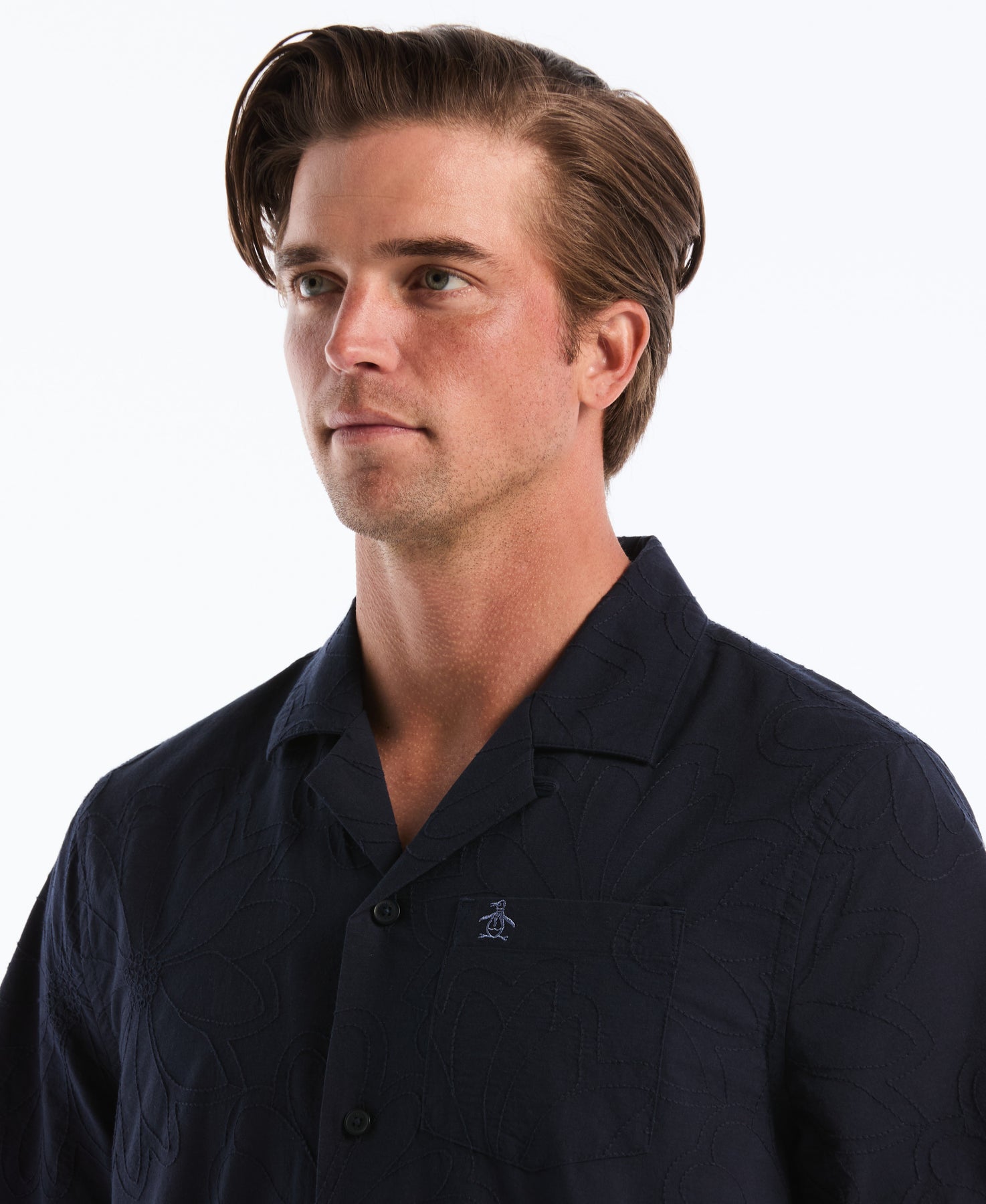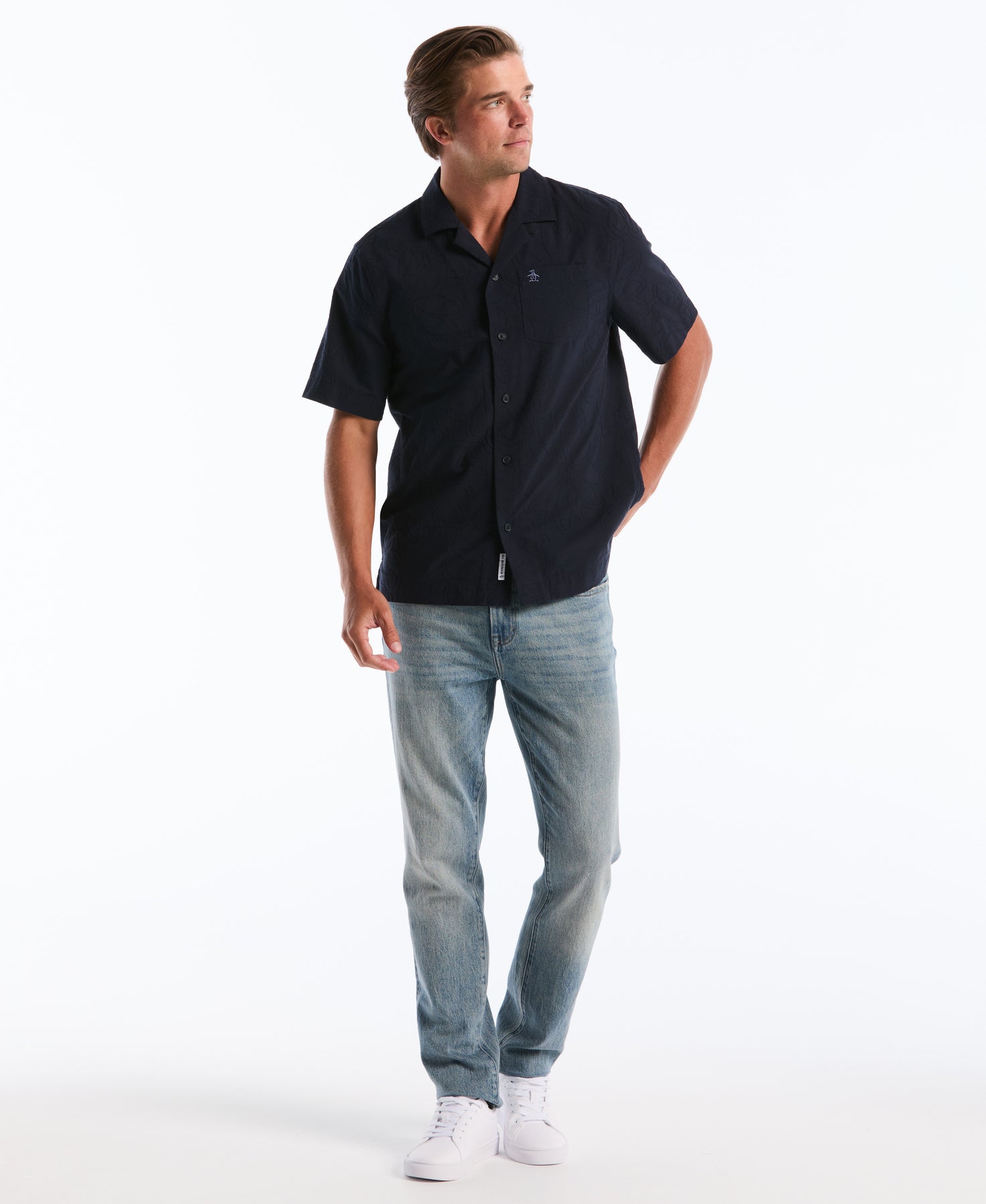 Unleash your inner cool with this eye-catching men's shirt from Original Penguin. Crafted from luxurious cotton fabric, this stylish shirt features an intricate all-over flower embroidery, perfect for turning heads. The trendy camp collar adds a laid-back vibe, while the modern slim fit provides a sleek silhouette that's always in style. Designed with classic short sleeves and a full button-down front, it's the ideal piece for your next outdoor gathering or vacation adventure. Elevate your casual wardrobe with this unique and comfortable embroidered cotton shirt.