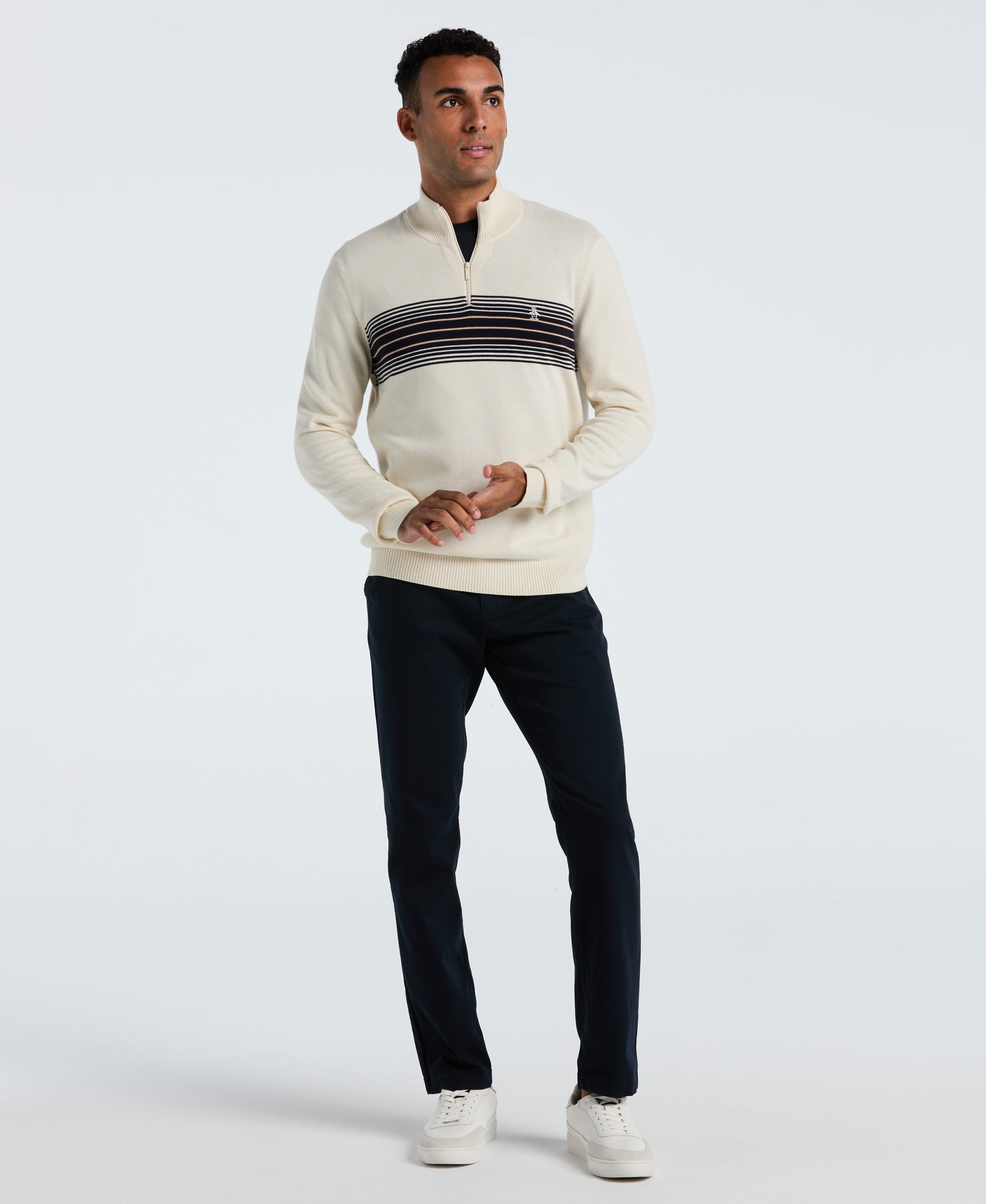Add some preppy style to your wardrobe with this Original Penguin men's sweater. Made from a lightweight cotton knit, this 1/4 zip sweater is soft, breathable and comfortable. The slim fit creates a modern profile, while ribbed cuffs and hem provide a neat finish. Eye-catching engineered horizontal stripes across the chest provide the perfect pop of visual interest for the classic style.