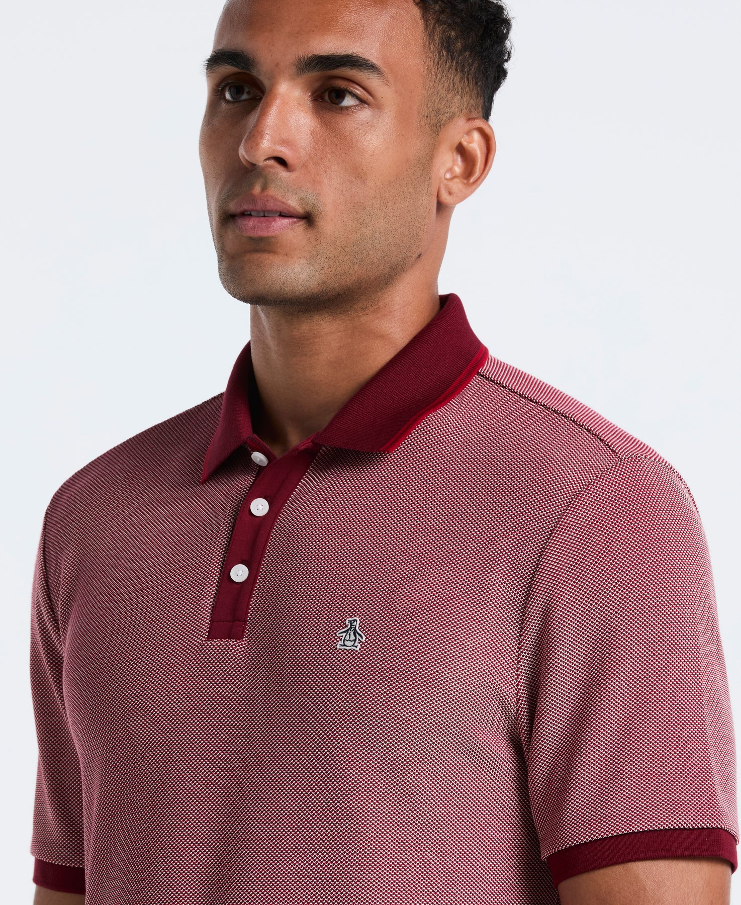 Upgrade your casual style with this patterned Original Penguin polo shirt. The cotton pique polo shirt features short sleeves and a classic polo collar, which makes it an adaptable separate for a variety of casual occasions. Comfortable pique fabrication adds texture to the classic design, while a slim fit provides a modern silhouette. With its dynamic tricolor design, this men's polo shirt will make a splash wherever you wear it.