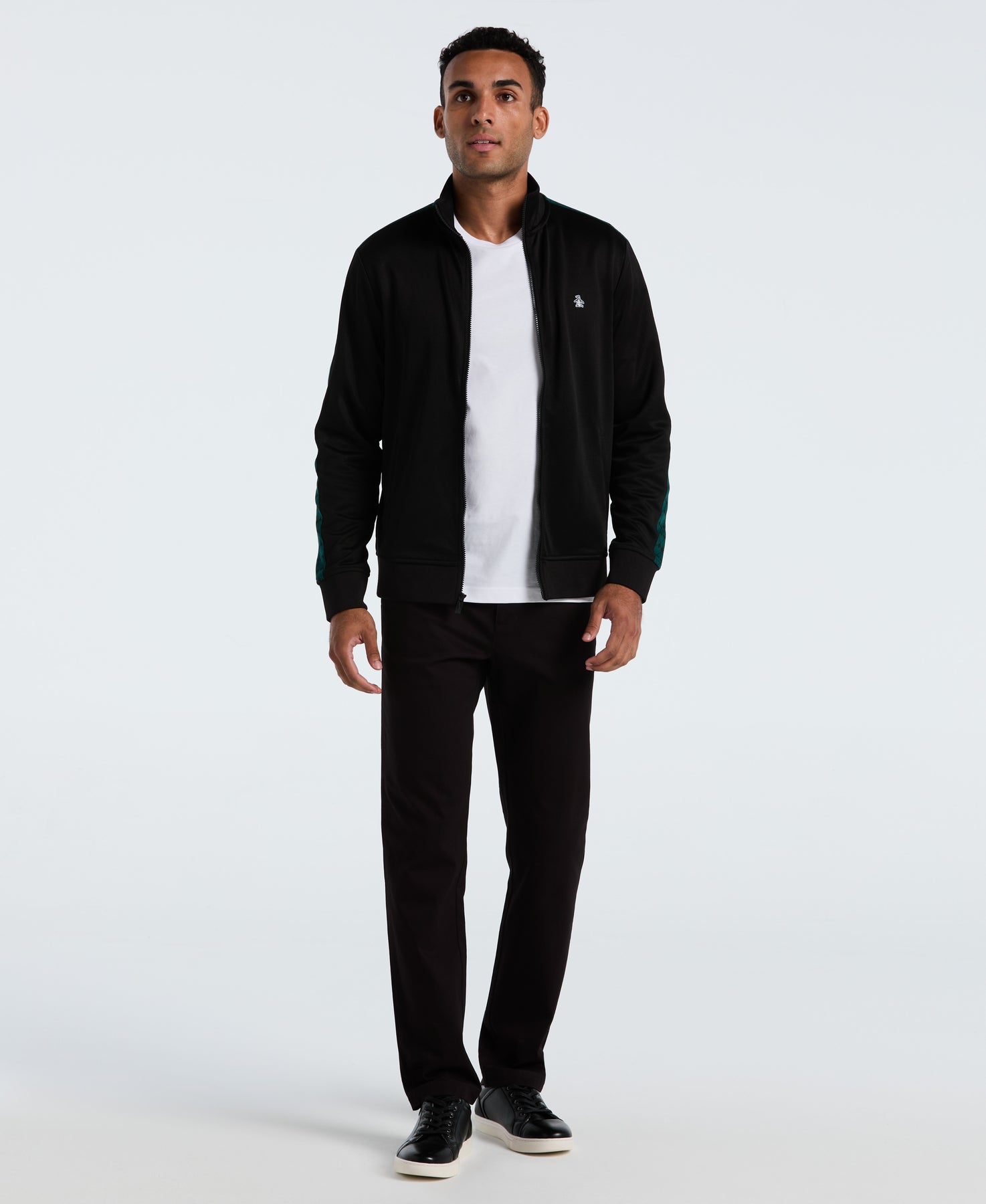 This Original Penguin track jacket will add some pep to your step. This slim fit jacket is crafted from lightweight double knit fabric. Vertical novelty tape detail adds a fun element for your stylish flair. This comfortable jacket is a great outwear choice that will soon become one of your favorites.