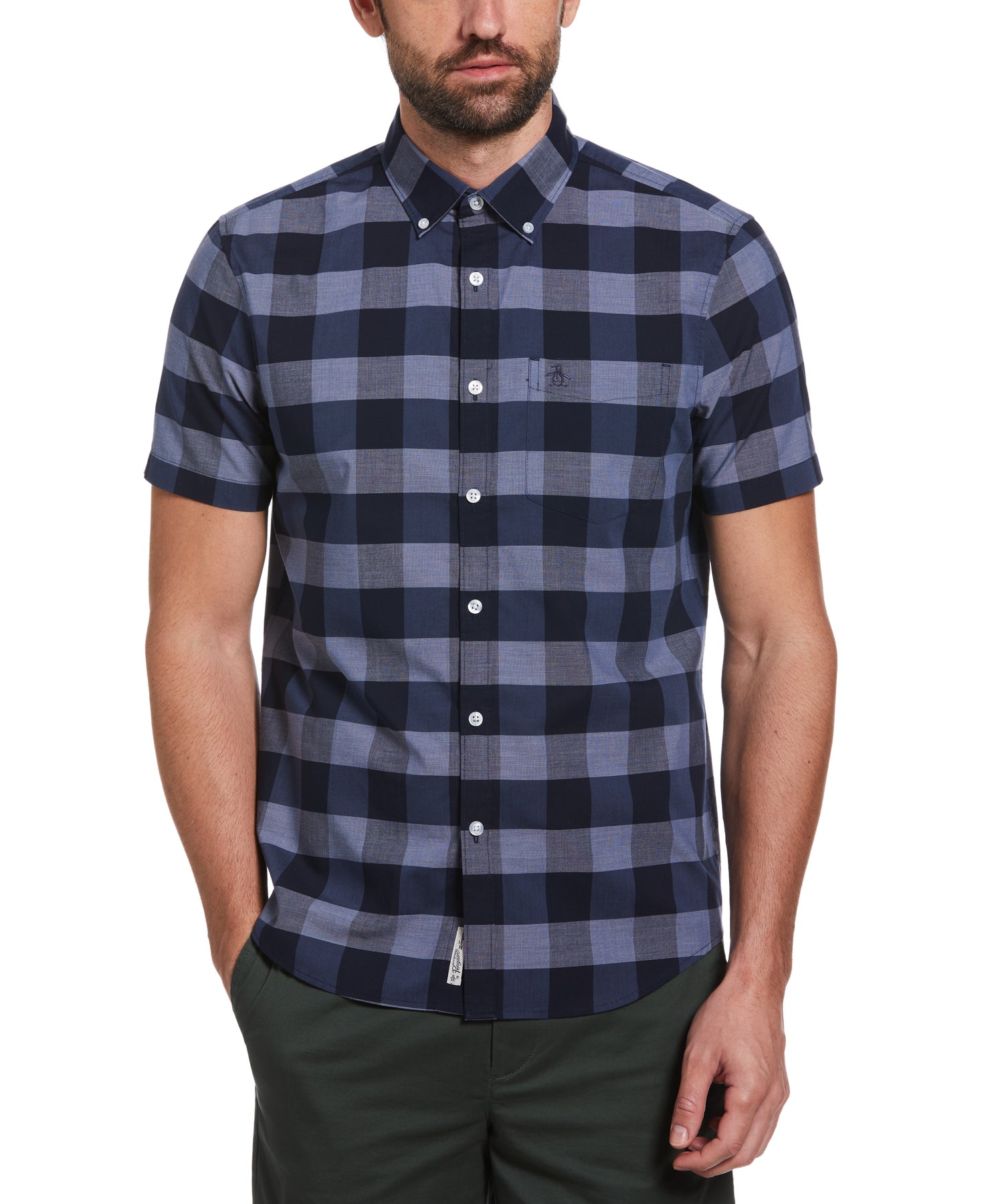 Say "hell yes" to this handsome Original Penguin button-down shirt. Plain weave fabrication weaves in extra durability. End-on end fabrication delivers a dual-toned finish that upgrades the plaid pattern. With its soft fabric finish and laid back style, this short sleeve shirt knows what it means to relax in total style.