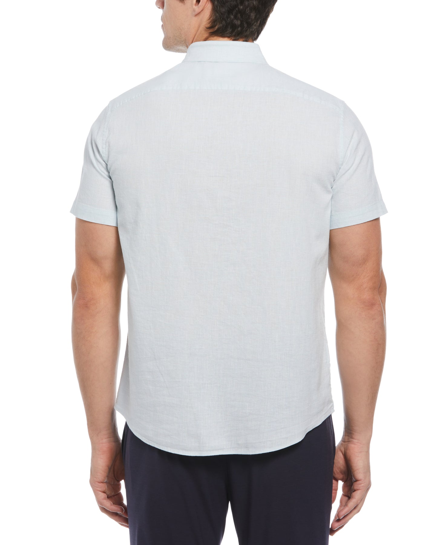 Our linen blend feeder stripe shirt has your back. This versatile short sleeve button-down brings lightweight, breathable comfort and style to any outfit this season. A mini collar and Pete embroidery on the chest complete the polished look of this slim fit men's pattern shirt.