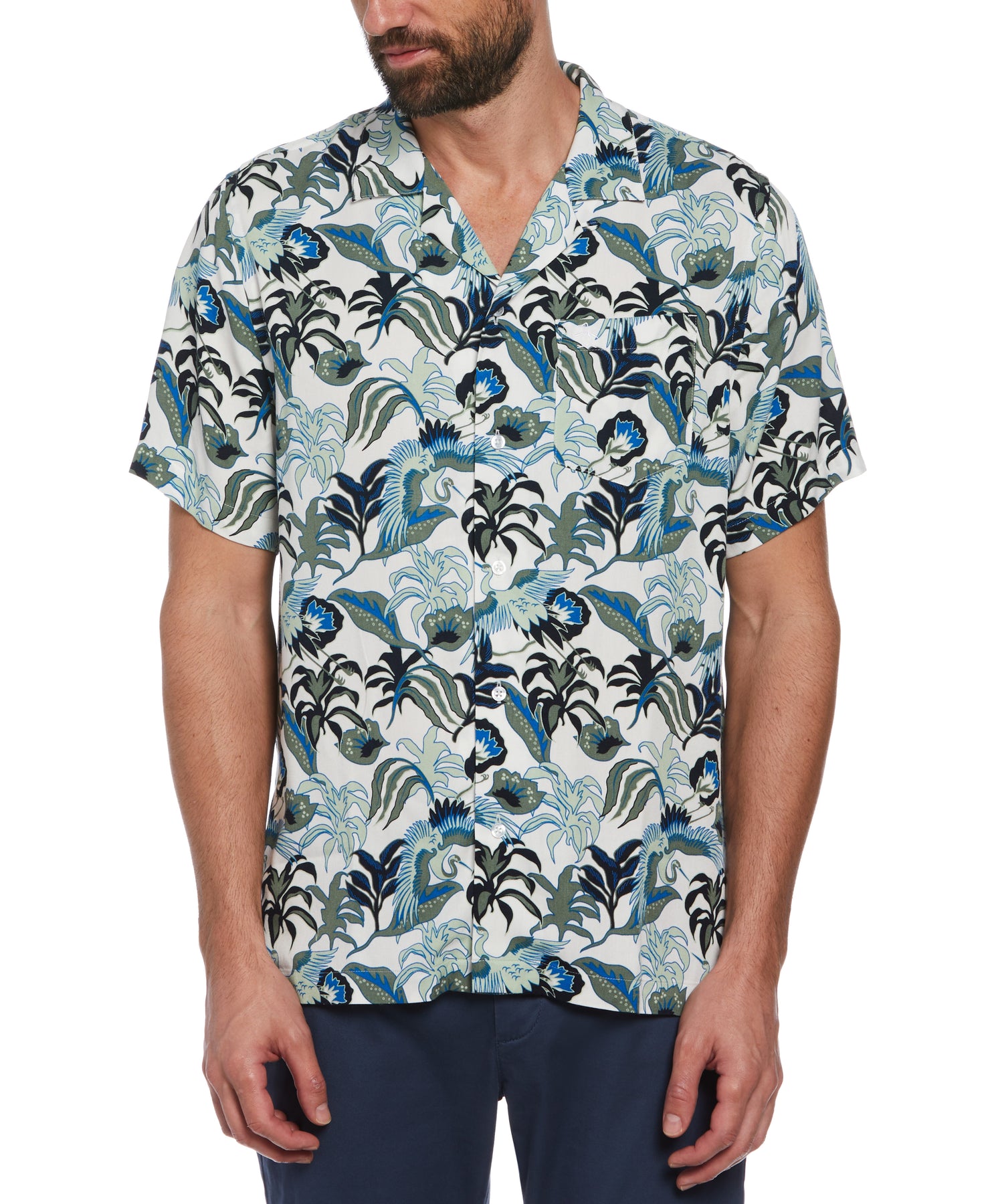 Let your style soar with this unique floral crane print men’s short sleeve shirt by Original Penguin. This men's floral shirt makes a stylish statement perfect for both casual outings and dressier occasions. It's designed with a classic camp collar and slim fit to add a touch of sophistication to any outfit. Crafted from luxurious 100% viscose 2/1 twill fabric, this men’s printed shirt delivers lightweight breathability and softness. Elevate your wardrobe with this men's printed shirt, an essential piece for any modern man's collection.