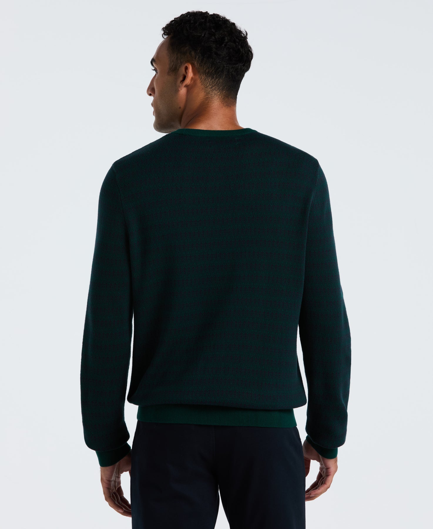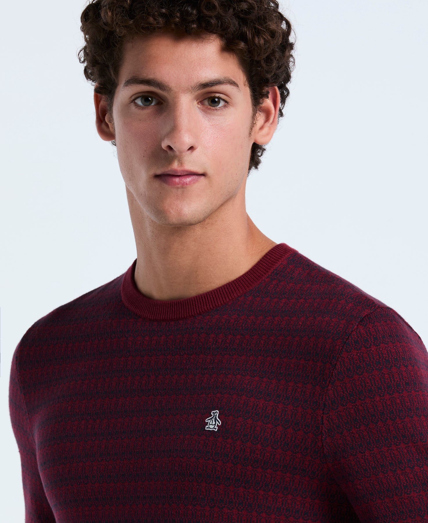 An all-over jacquard knit geometric pattern adds eye-catching flair to this Original Penguin men's sweater. The long sleeve sweater is crafted from a soft cotton blend for cozy comfort. It's designed with a slim fit for a modern silhouette that looks great on its own or layered under a jacket or coat. The classic crew neck design pairs easily with a range of casual looks.