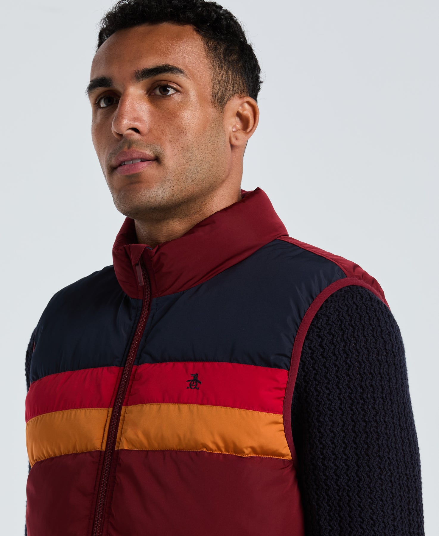Ideal for transitional weather, this Original Penguin men's vest will add a layer of warmth without weighing you down. The sleeveless vest is crafted from a lightweight plain weave fabric with a water-resistant finish to help keep you dry in light rain. It has a hi-density surface, lending a sleek look to the versatile solid-colored design.