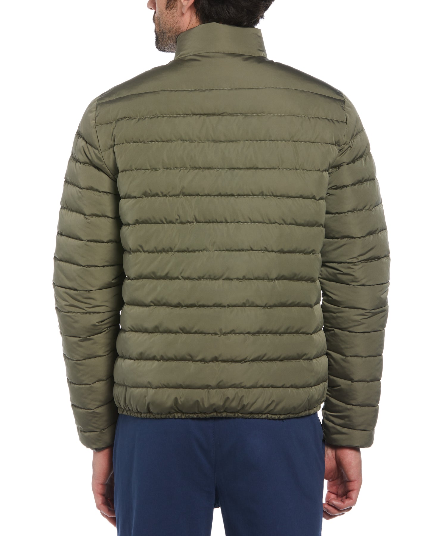 Don't let the chilly weather stop you, this Original Penguin lightweight puffer jacket for men is the perfect layer to keep you warm. The durable plain weave fabric is water resistant to handle the elements. A poly filling provides the insulation you need without adding bulk to ensure a sleek slim fit. Zip it all the way up to the top of the mock neck collar to keep the wind out on cool days.