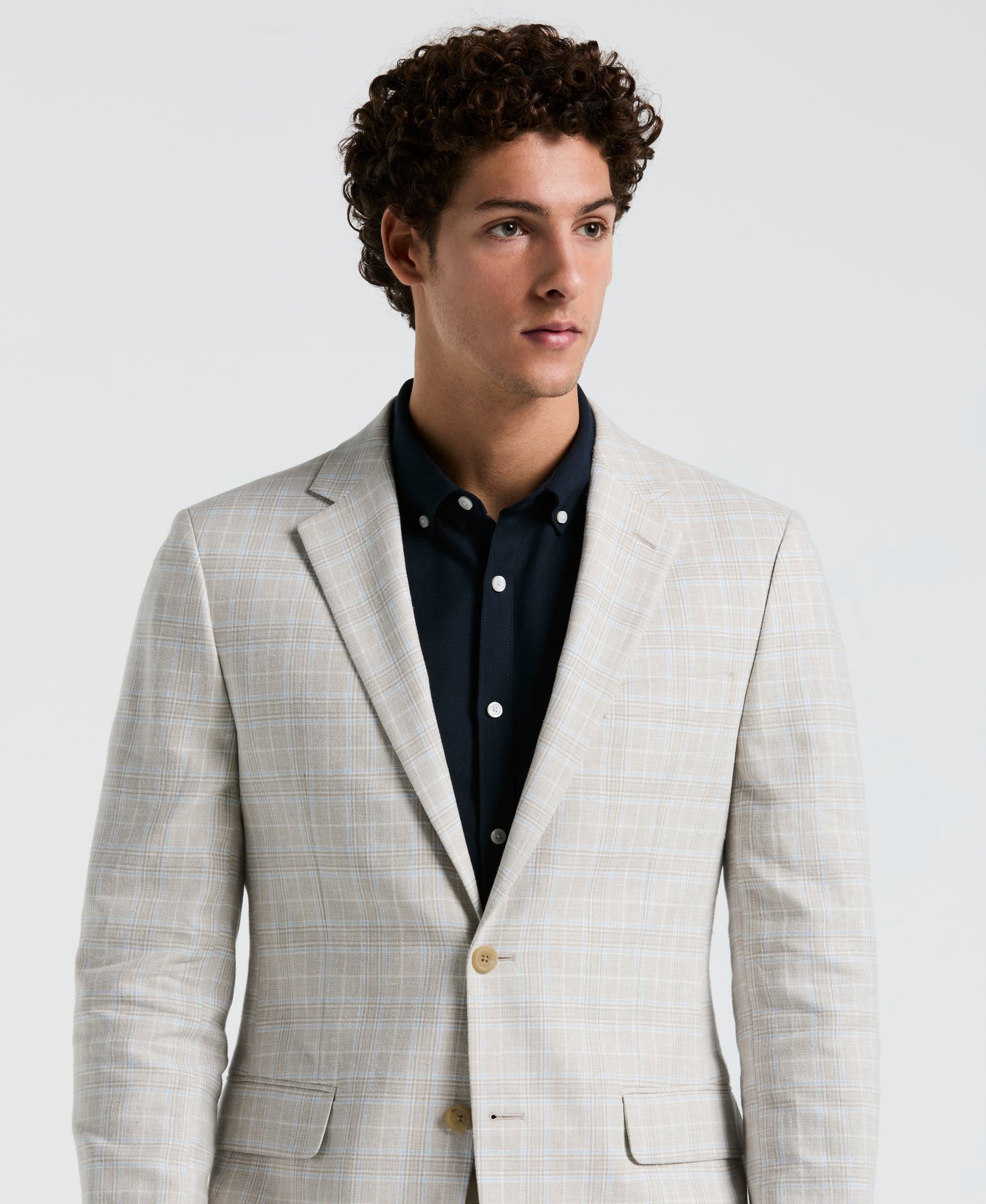 Linen Cotton Plaid Coat Sport Coat (Tan/Blue)