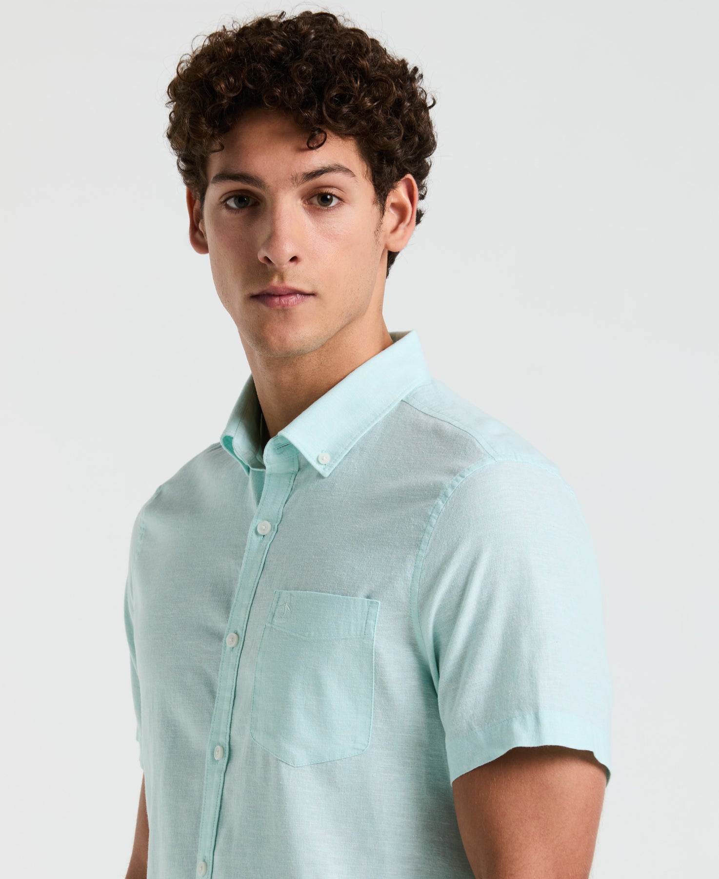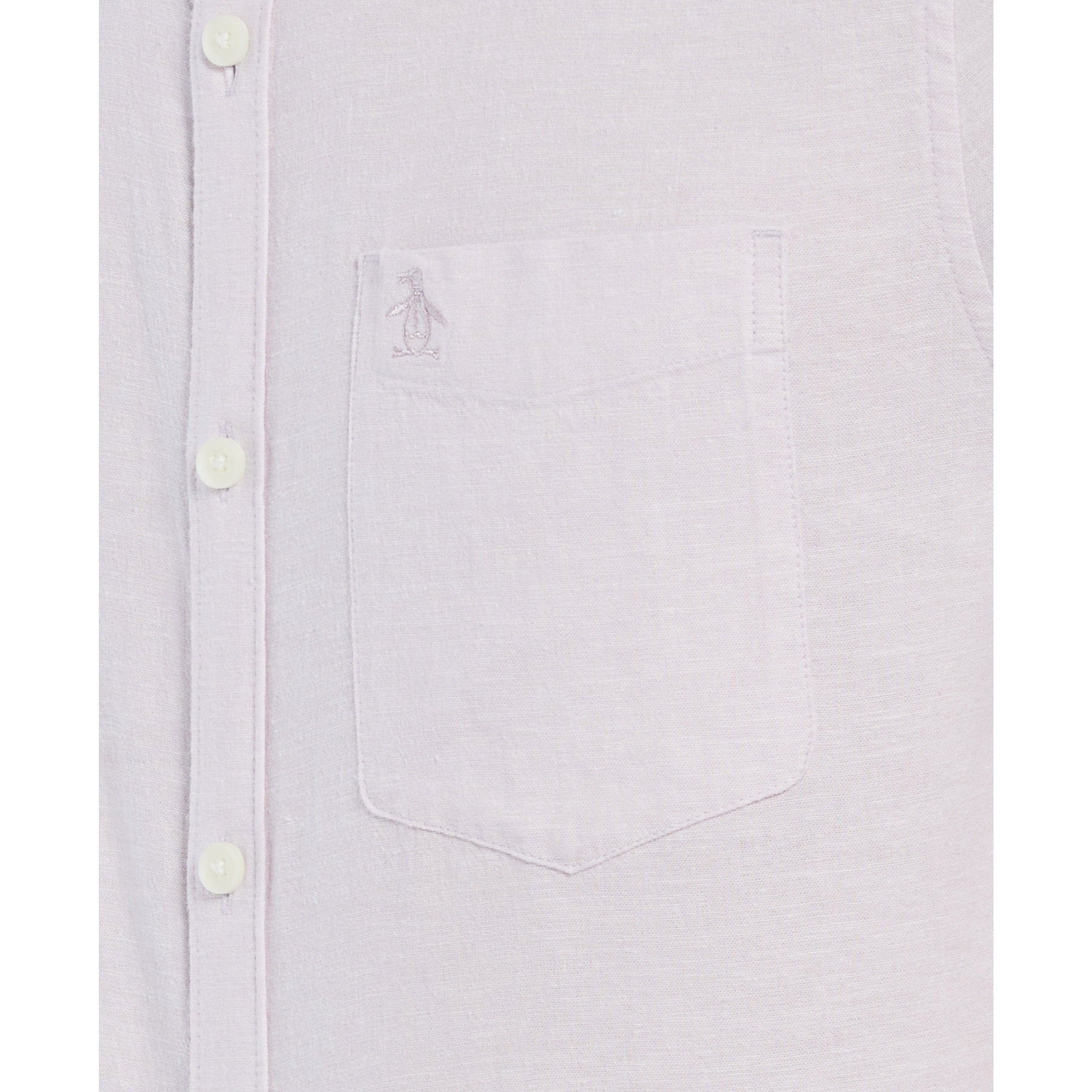 Stay cool and comfortable on your next sunny adventure with this breathable linen blend shirt from Original Penguin. The men’s short sleeve shirt is crafted from a plain weave fabric for impressive durability. It has a hint of stretch for a flexible fit, and the collar buttons down to keep your look sharp and put-together. Featuring a versatile solid-colored design, it’s easy to pair with your existing warm weather apparel.