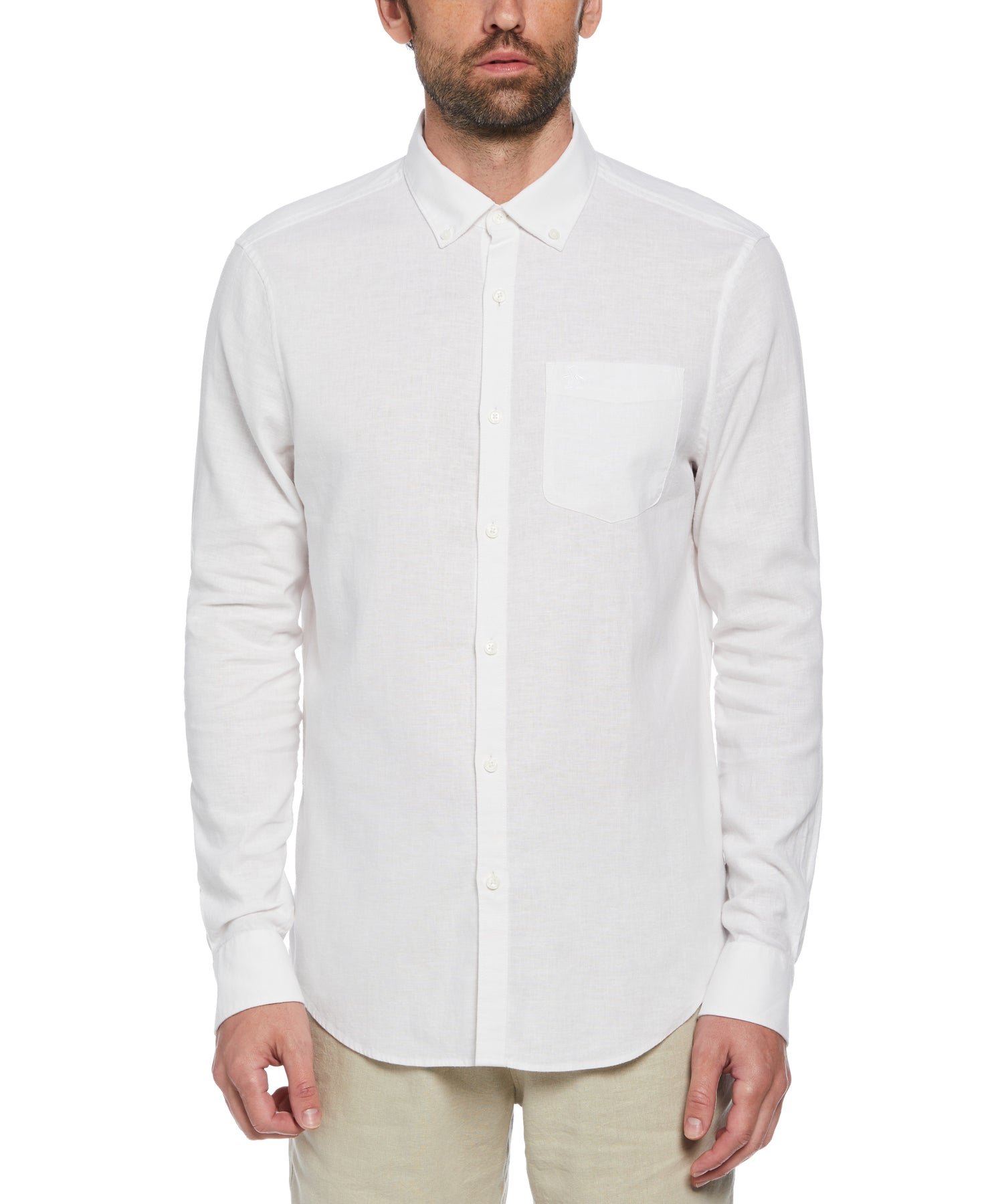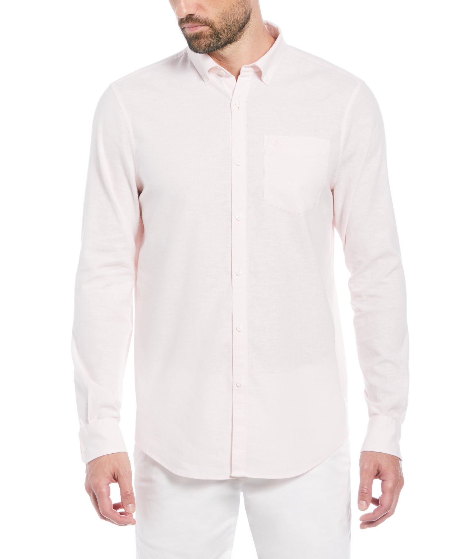 This Original Penguin linen-blend long sleeve shirt is the ultimate choice for both easy style and all-day comfort. With its slim fit design, button-down collar and durable plain weave fabric, this men's button-down shirt is the ideal choice for any occasion. The stretch fabric ensures maximum comfort and ease of movement while the timeless solid color design is easy to pair with a range of bottoms, making it a must-have essential for any wardrobe.