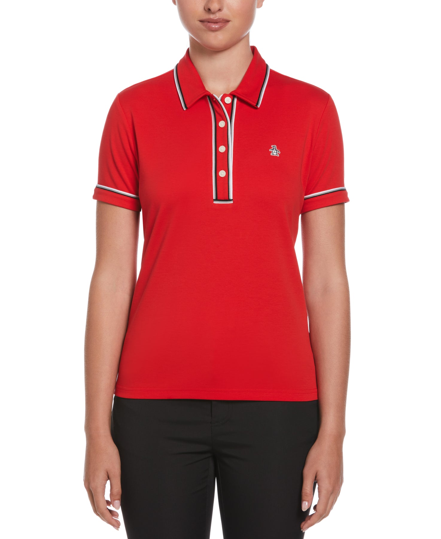 Elevate your casual wear with sustainable fashion with this women's polo from Original Penguin. Crafted from 100% organic cotton, this polo shirt is an eco-friendly choice. It also features interlock fabrication for natural stretch and a comfortable fit and feel while the contemporary silhouette and piping details add a refined touch.