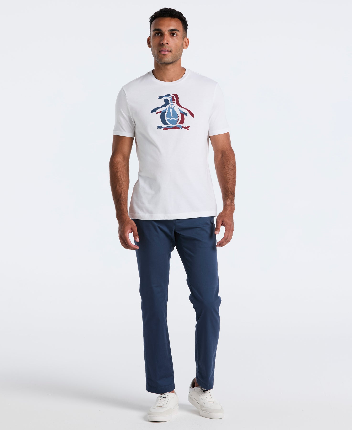 Step up your tee game with this stylish Original Penguin t-shirt for men. The comfortable men's tee is crafted from soft jersey fabric, in breathable cotton. The slim fit creates a modern silhouette, while a ribbed crew neck completes the stylish and casual design. An eye-catching graphic adds a dash of contemporary style.