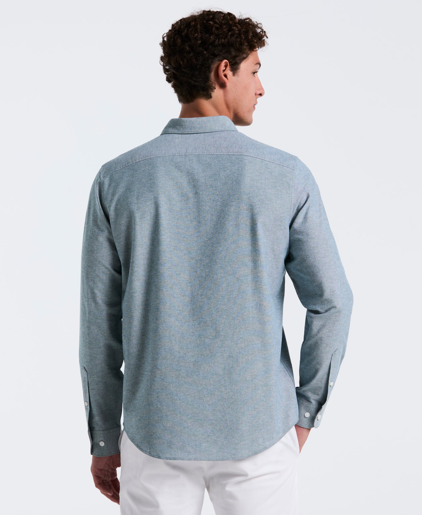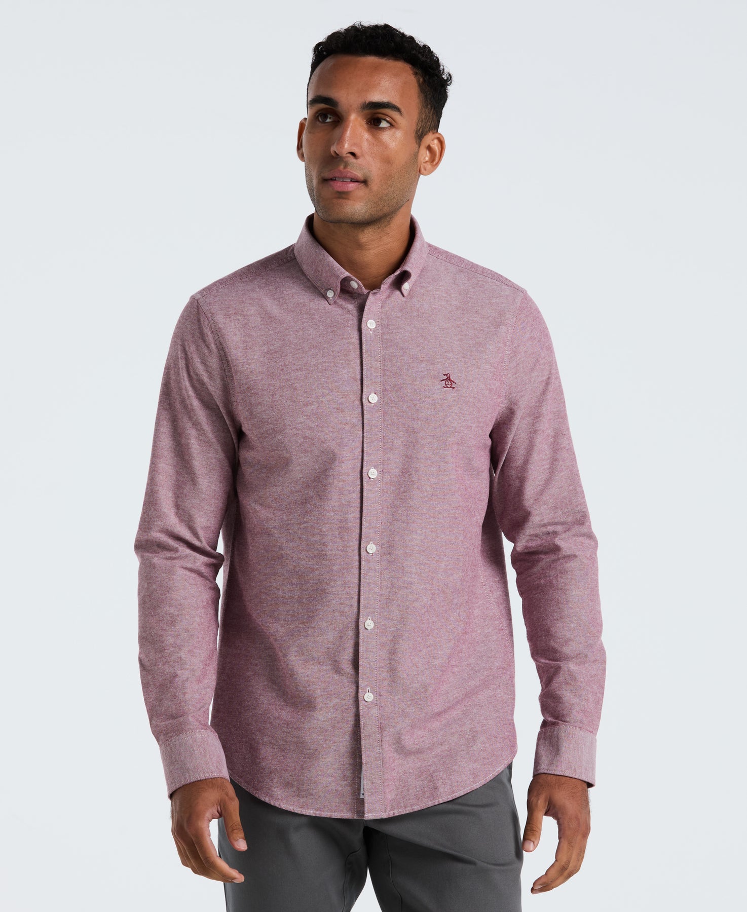 A smart wardrobe essential, this Original Penguin men’s button-down shirt has a versatile solid-colored design perfect for any casual outing. It’s made with Oxford fabric, which is crafted with a braided weave for impressive durability and a subtle textured look. The slim-fitting shirt is enhanced with stretch for a flexible fit, and it has a button-down collar to keep your look polished as you work through your errands or enjoy a relaxing night out on the town. Our mascot Pete the penguin appears as a logo on the chest, adding a fun finishing touch.