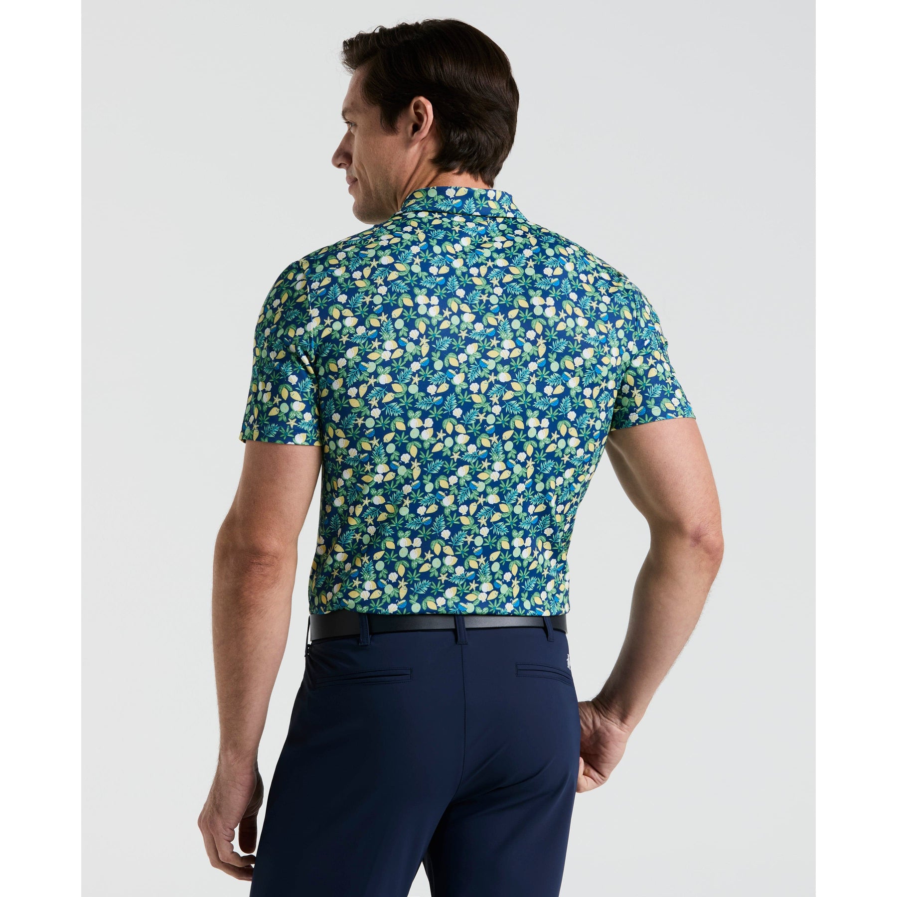 Head to the course in style wearing this Original Penguin men's golf polo. The single knit fabrication creates a lightweight feel, while added stretch provides a comfortable fit that moves with you. For warmer days, moisture-wicking will keep you feeling dry, even as your game heats up. A fun print and sleek self collar make this golf shirt a great addition to your golf wardrobe.