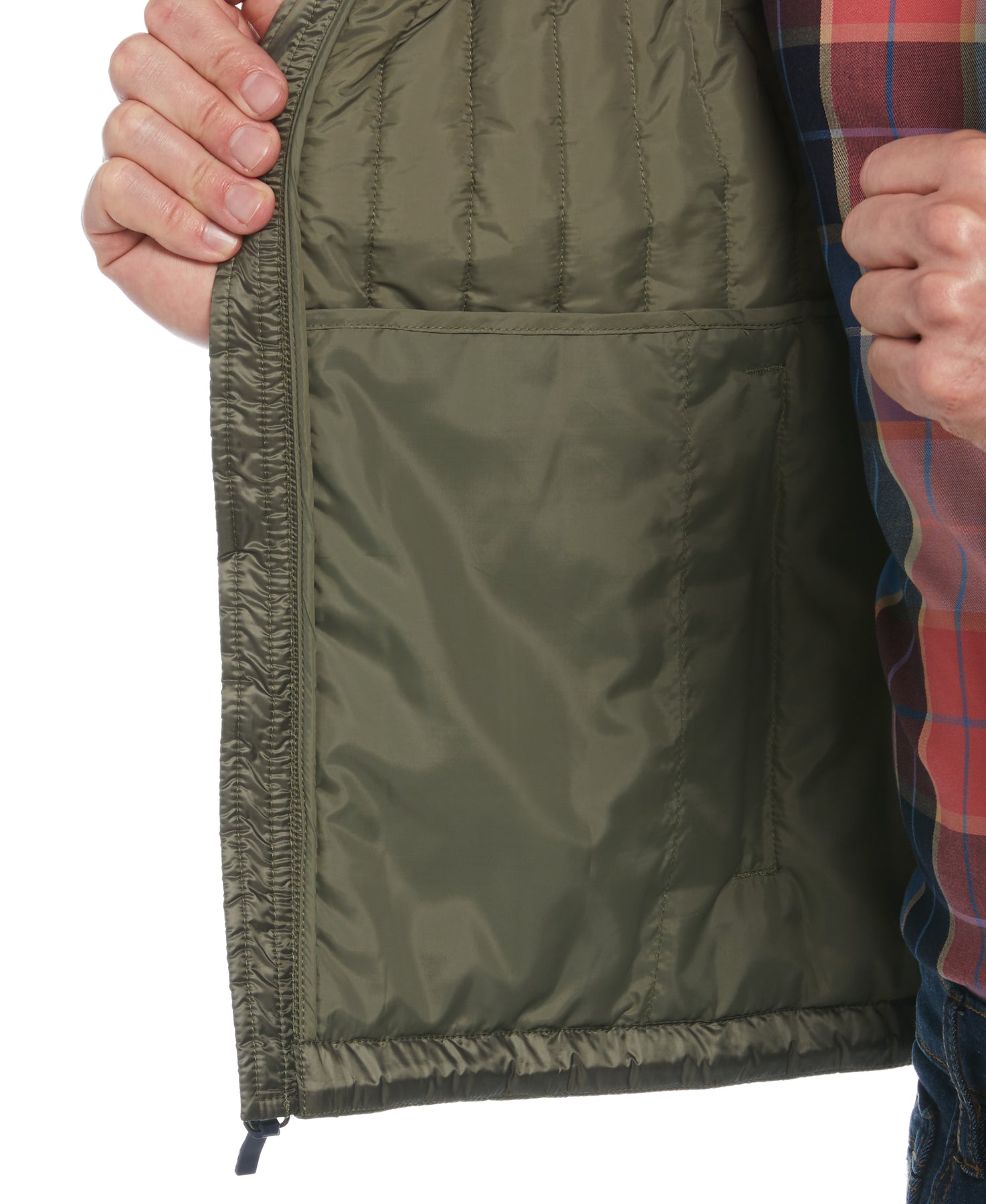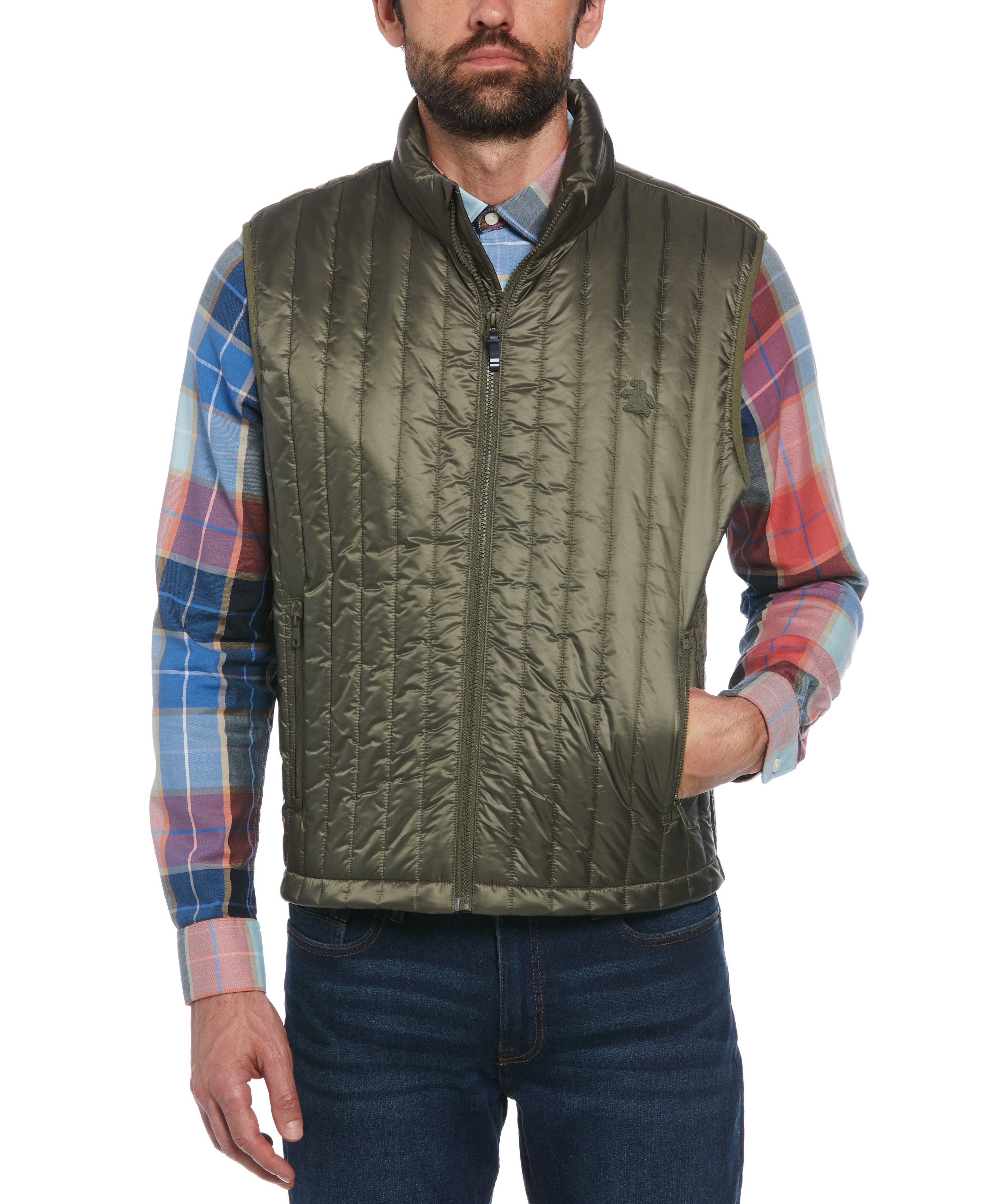 Upgrade your outerwear with this eco-friendly Original Penguin men's vest designed for warmth and style. Crafted from 100% recycled polyester made from plastic bottles, this sleek slim fit vest merges sustainability with fashion. The plain weave fabrication delivers enhanced durability, while the full zipper allows for easy wear and layering. A sophisticated vertical channel design completes the look.