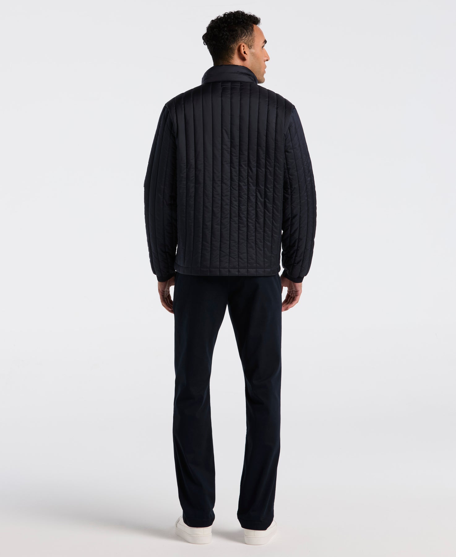 Stay warm and dry in this Original Penguin men's jacket. Made from 100% recycled polyester it has poly fill insulation to keep you warm and a quilted design. The durable plain weave jacket includes a full zip, mock neck collar, and zippered side pockets. Its water-resistant fabric ensures protection against the elements, making it a practical addition to your outerwear collection.