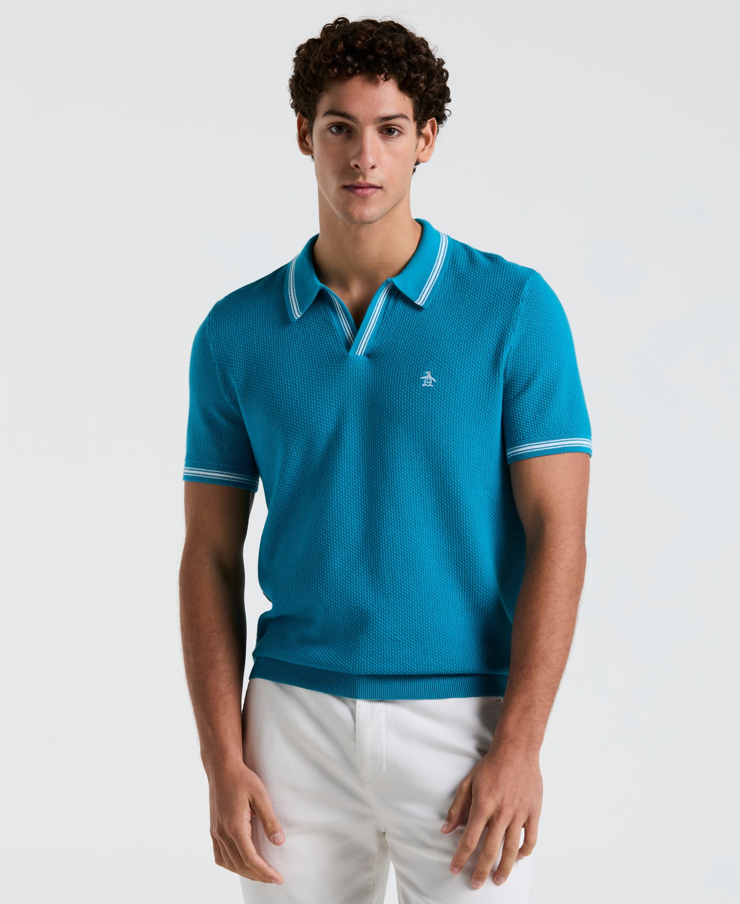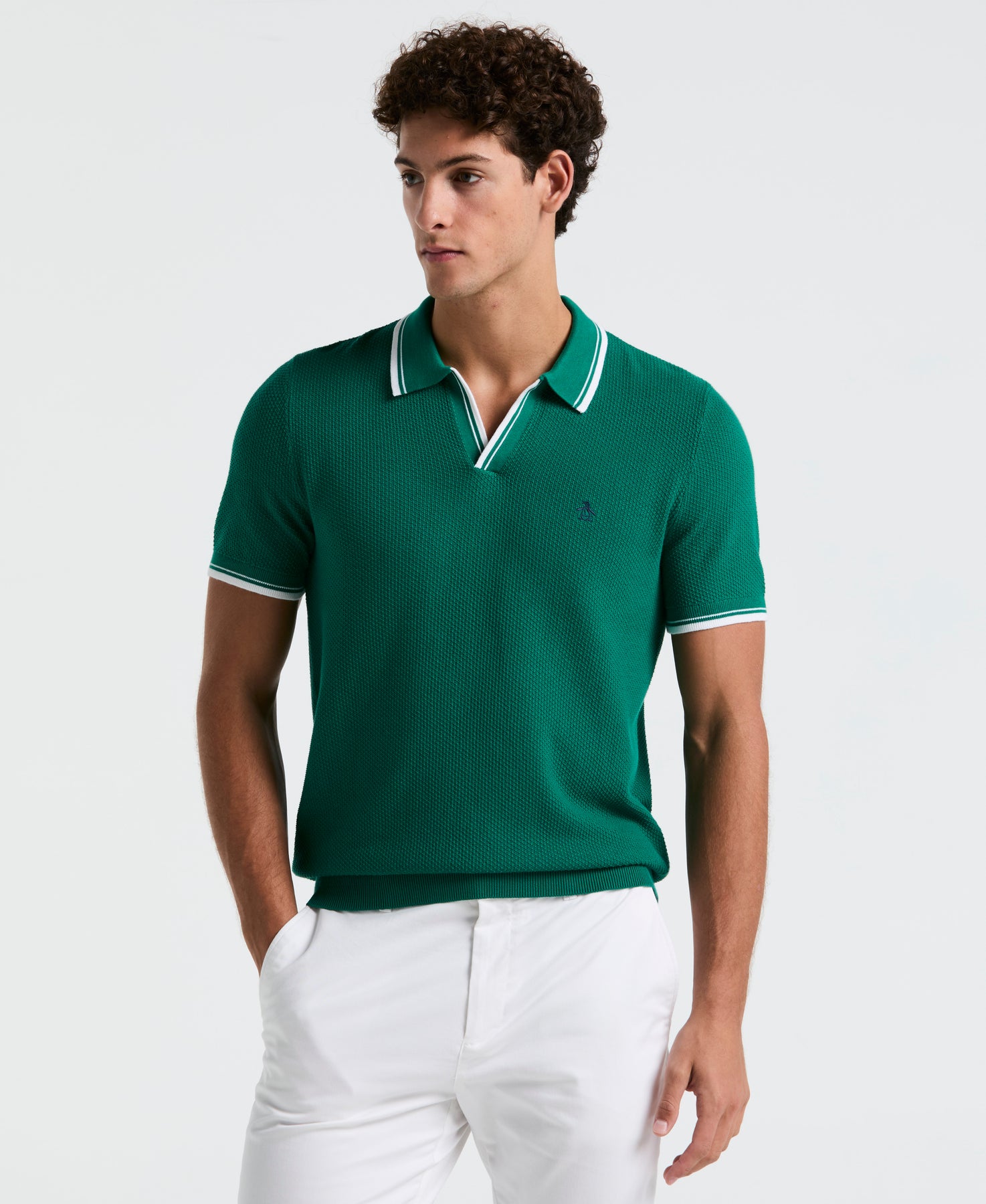 Crafted from soft, breathable cotton, this men’s sweater polo from Original Penguin puts a cozy spin on a warm-weather classic. Cut for a slim fit, the short sleeve sweater offers a flattering, modern look. Styled with a ribbed collar and a timeless johnny collar, this sophisticated sweater will complement everything from khakis to jeans.