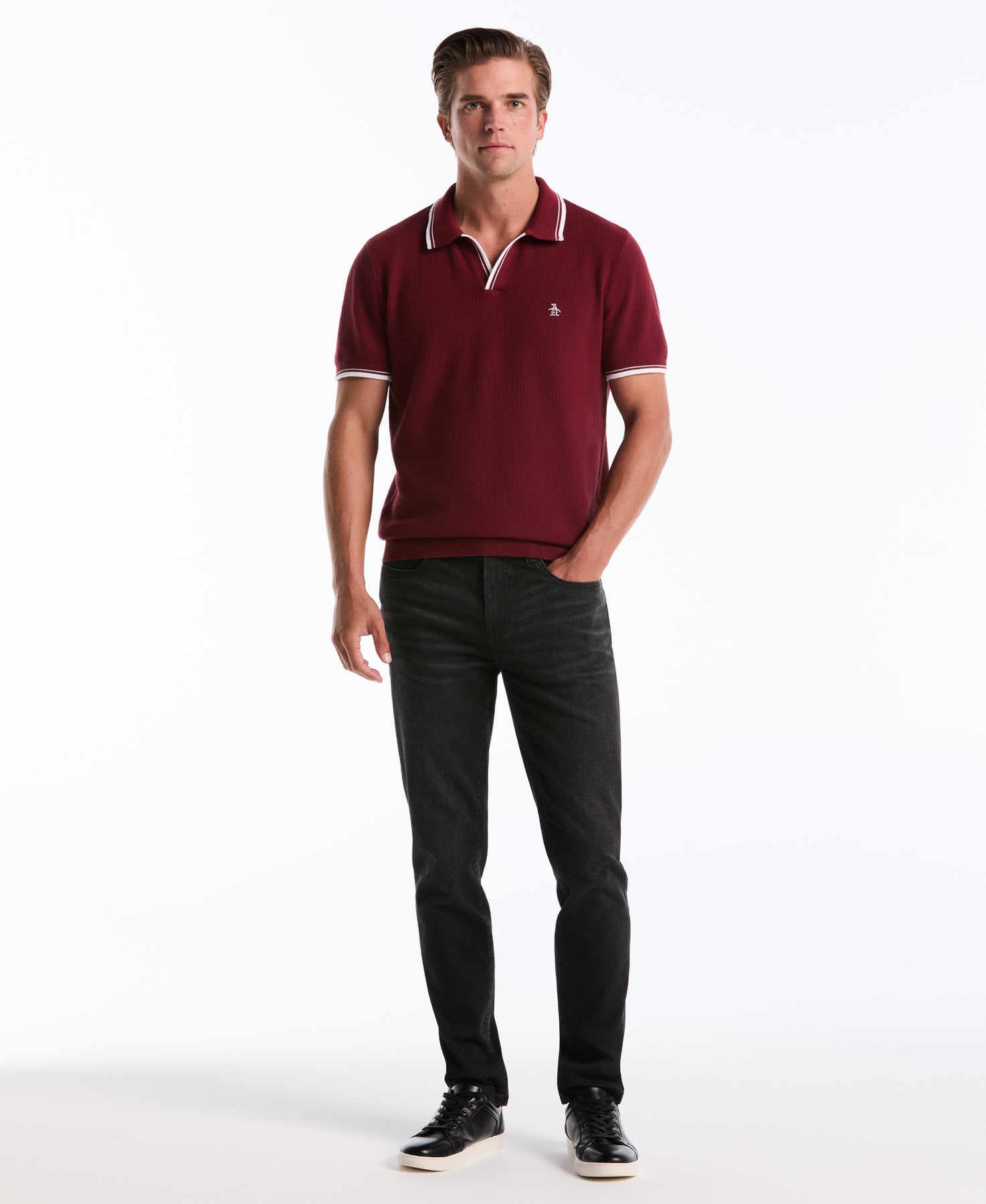 Crafted from soft, breathable cotton, this men’s sweater polo from Original Penguin puts a cozy spin on a warm-weather classic. Cut for a slim fit, the short sleeve sweater offers a flattering, modern look. Styled with a ribbed collar and a timeless johnny collar, this sophisticated sweater will complement everything from khakis to jeans.