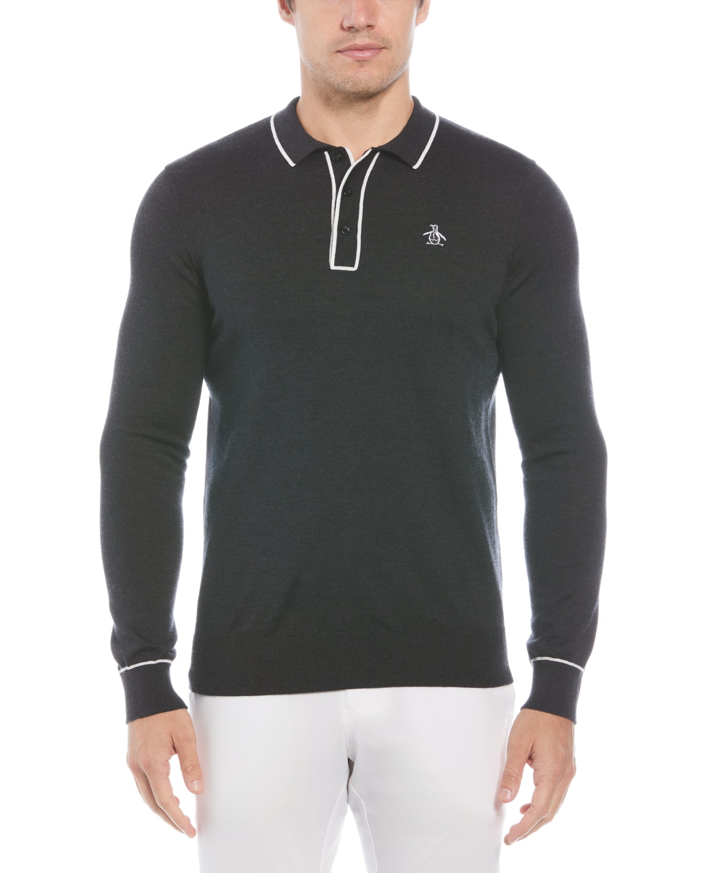 Made with luxuriously soft, naturally moisture wicking merino wool blend fabric, this Original Penguin sweater for men offers an exceptional balance of style and comfort. Piping at the collar, placket and cuffs adds contrast to the solid-colored design of the men’s sweater for a sophisticated yet casual look. A hint of stretch in the material helps to ensure a flexible fit and unrestricted movement, while a sticker-inspired logo on the chest adds a fun finishing touch.