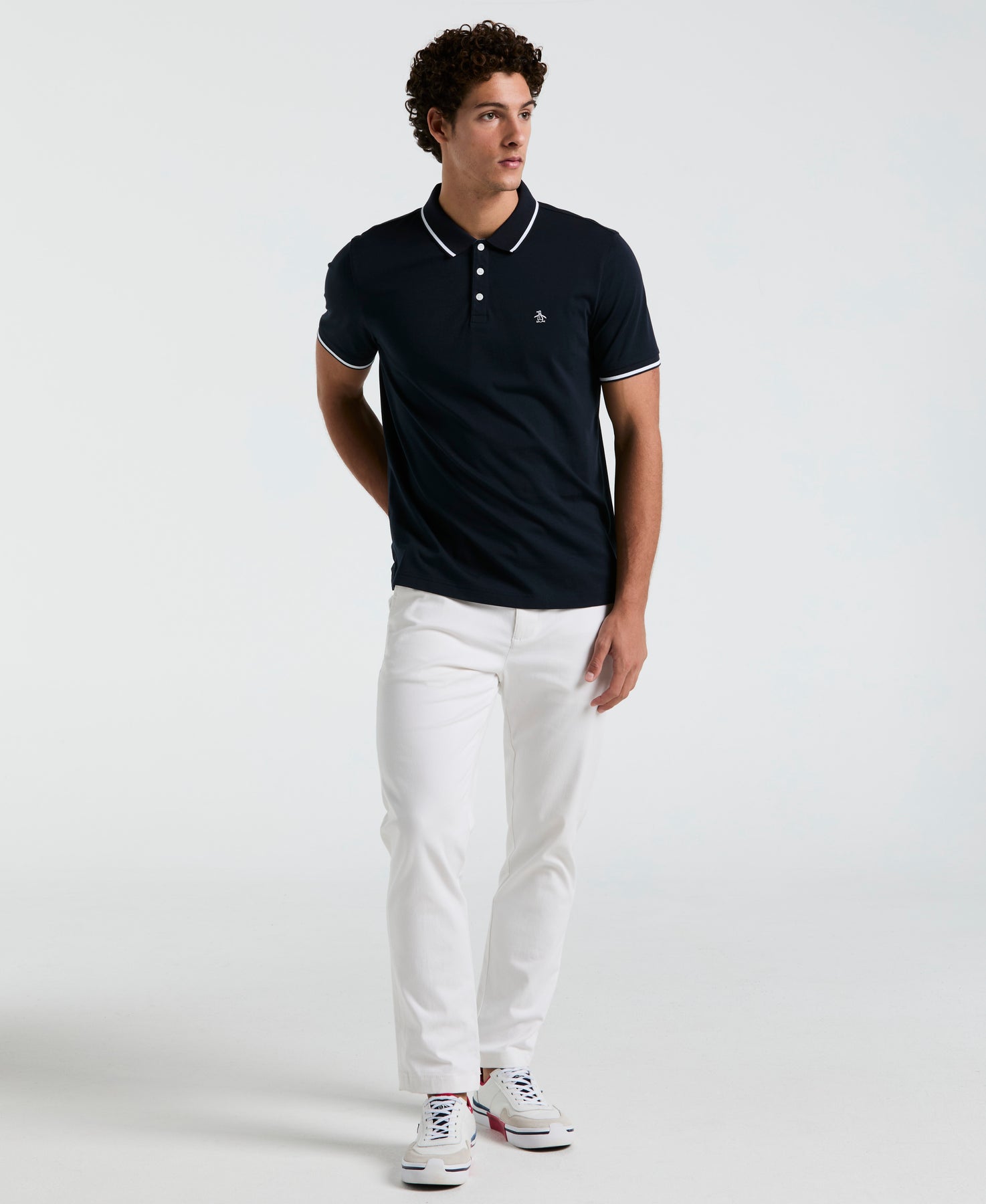 Look sharp in this Original Penguin men’s polo. With contrasting tipping on the collar and sleeves, this shirt adds a touch of style to any outfit. The jersey fabrication makes it feel soft against your skin for all-day comfort. The slim fit gives a modern silhouette and our iconic Pete logo on the chest adds sporty style to this men’s collared shirt.