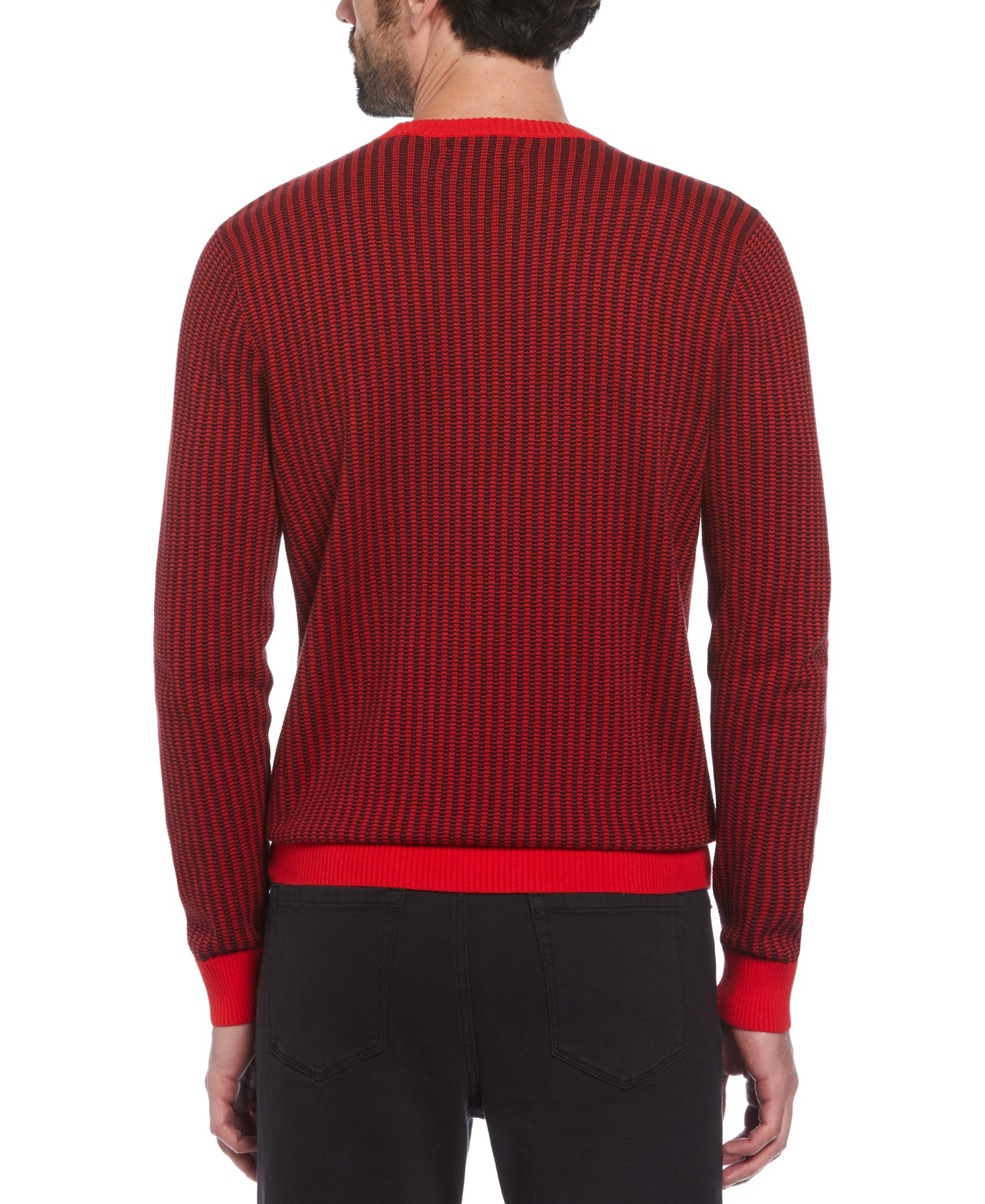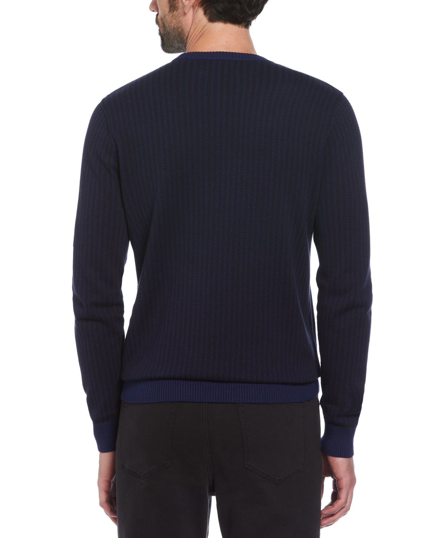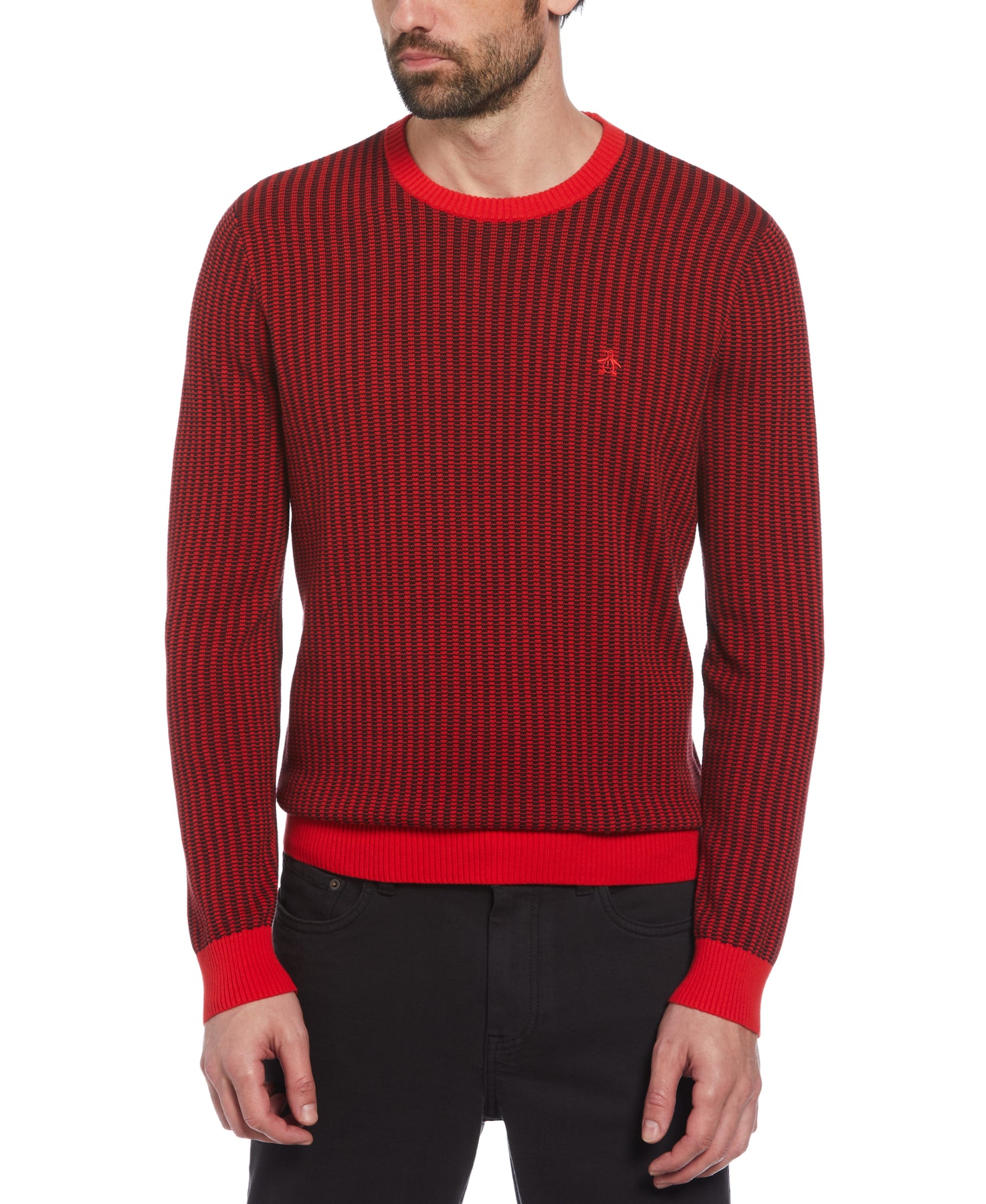 Featuring a tonal jacquard pattern, this Original Penguin men’s pullover sweater offers a sophisticated look that will be a hit at both family get-togethers and game nights with the guys. The casual men’s crew neck sweater is made from 100% cotton fabric, which breathes for comfort in changing weather conditions. An embroidered logo on the chest featuring our mascot Pete the penguin adds a subtle accent to the design.