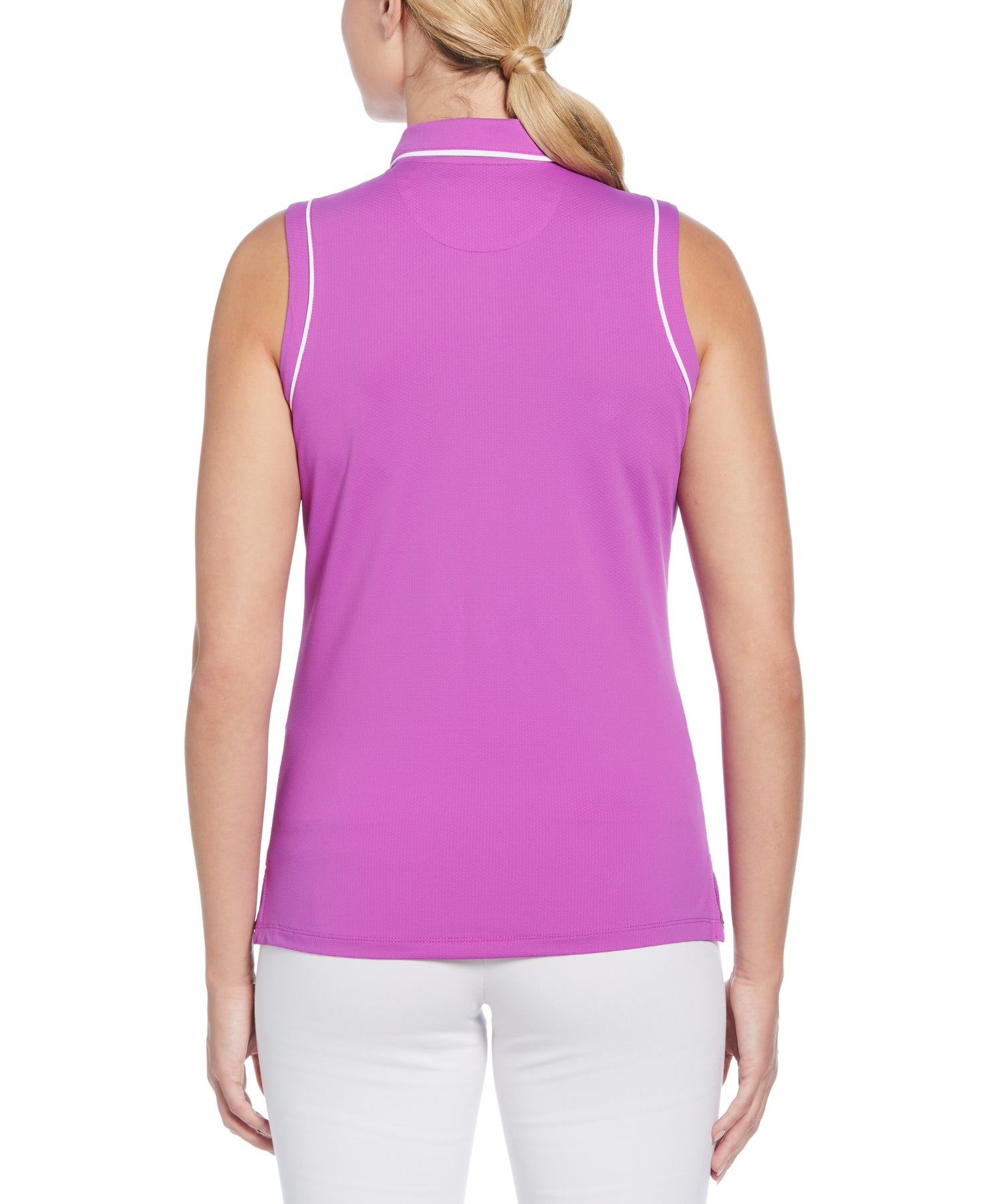 Get the perfect blend of style and comfort with this women's golf polo shirt. Crafted with pique fabric, this golf top has raised cords woven into the material to add texture and give your golf outfit a refined touch. The sleeveless design and contrast piping details elevate the overall look, making this golf top a great choice for your next game or casual wear.