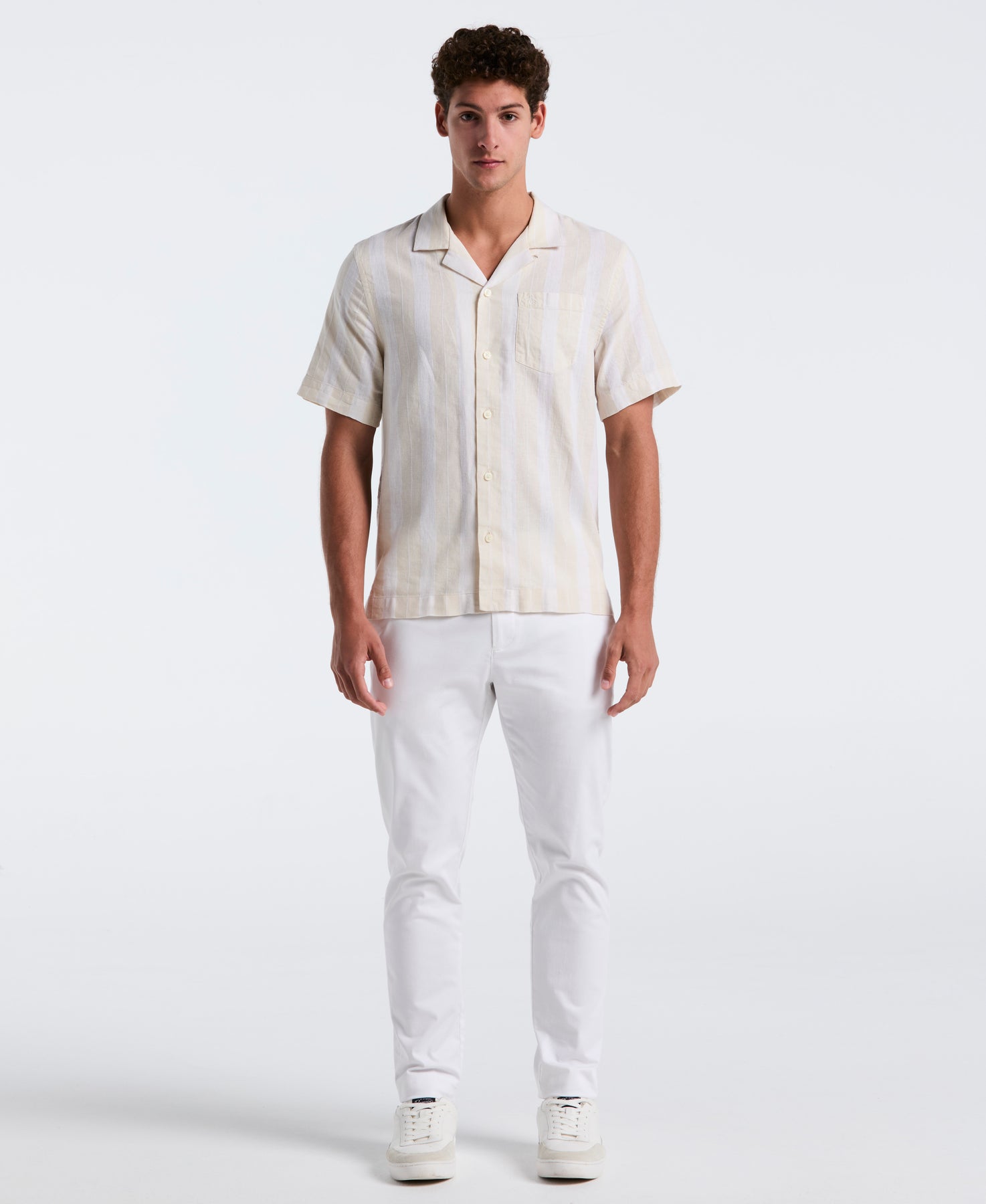 This bold Camp Vertical Stripe Pocket Shirt boasts a herringbone fabrication made of 55% linen and 45% cotton, giving it both durability and a lightweight feel. The slim fit and camp collar create a sleek silhouette, while the embroidered Pete on the left chest pocket adds a playful touch. Machine washable for easy care.