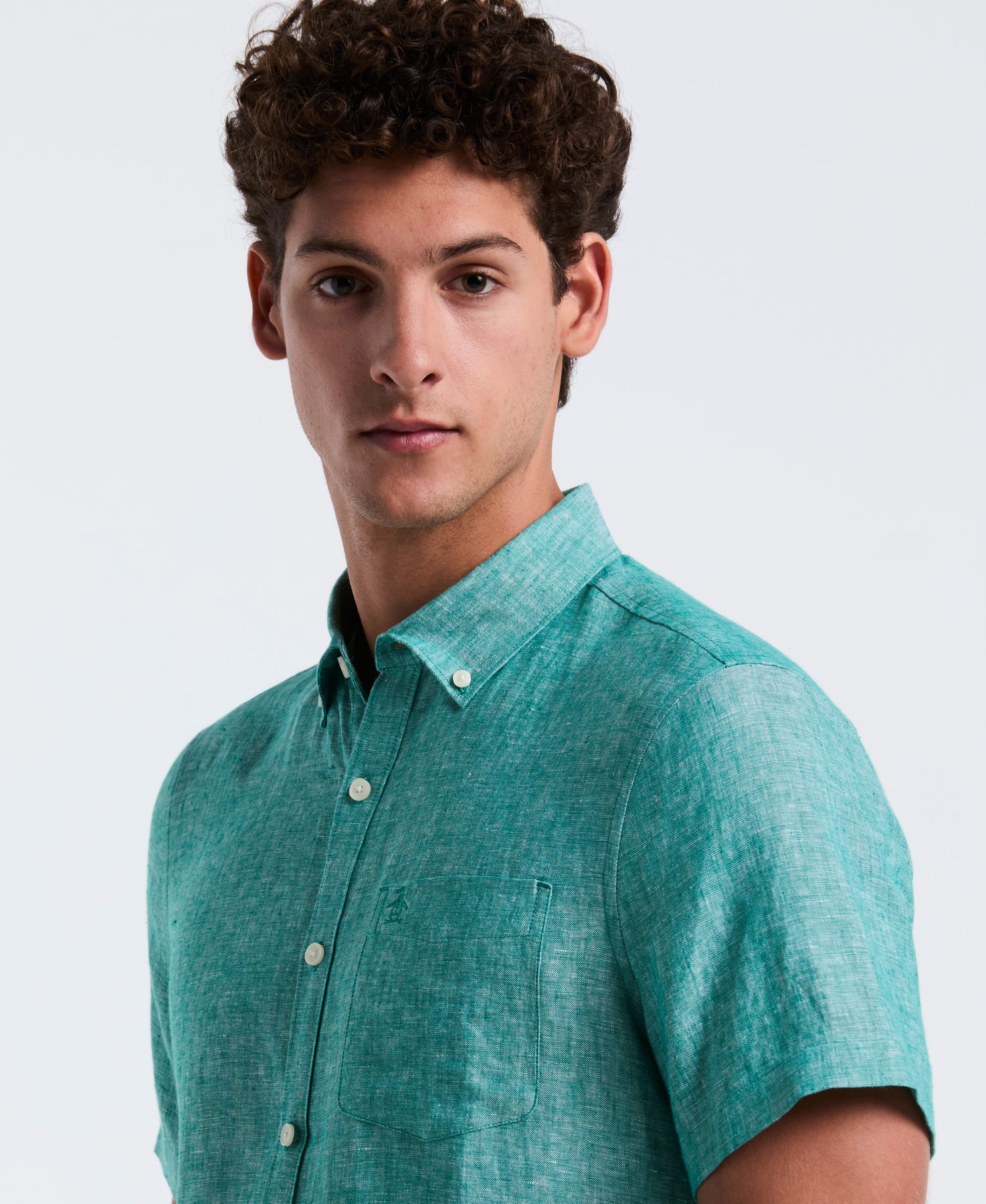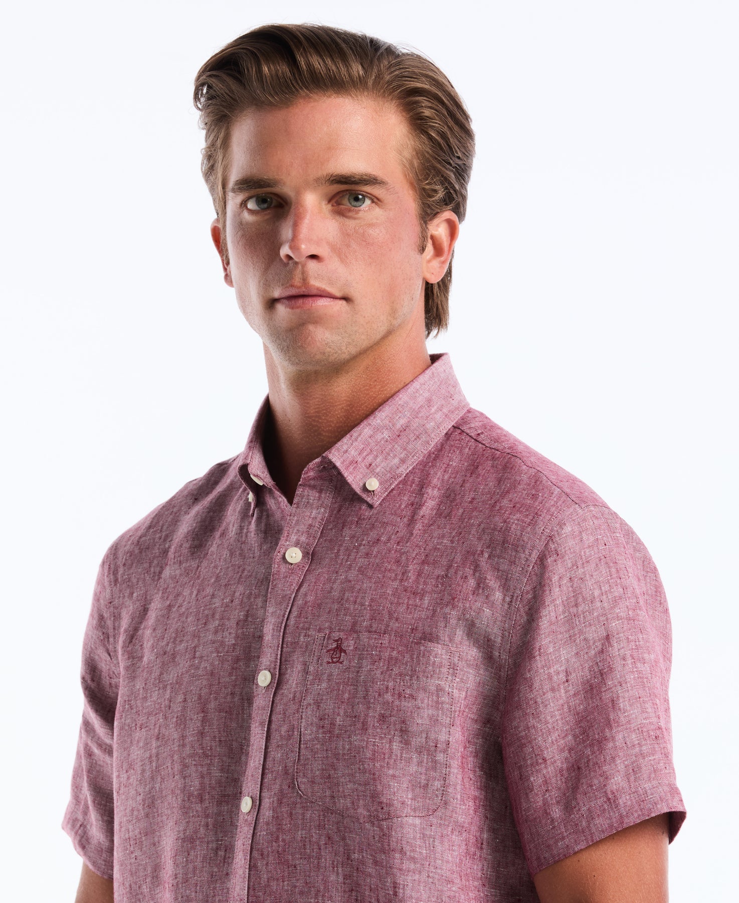 Made from light and breathable 100% linen fabric, this men’s button-down shirt from Original Penguin will help you stay cool as you navigate through sunny streets or relax poolside on your next vacation. A great everyday basic, this solid-colored shirt has been washed for added comfort and softness. The fabric is made with a durable plain weave that stands up well to regular wear and tear, and the collar buttons down to help keep your look neat and presentable.